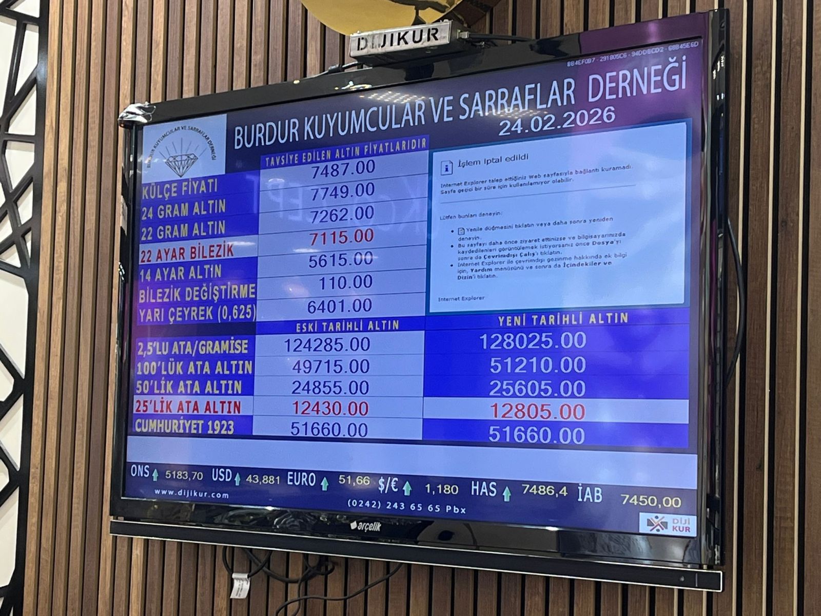 Burdur Kuyumcular ve Sarraflar Derneği tarafından 24 Şubat 2026 Salı günü saat 09.00 itibarıyla güncel altın fiyatları şu şekilde: