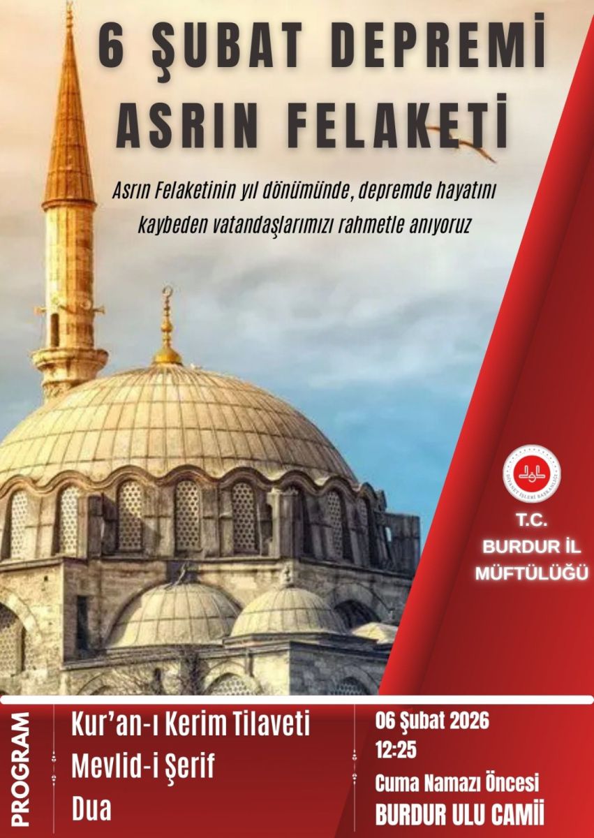T.C. Burdur İl Müftülüğü tarafından organize edilen anma programı, 6 Şubat 2026 Cuma günü, Cuma namazı öncesinde saat 12.25’te, Burdur Ulu Camii’nde gerçekleştirilecek.