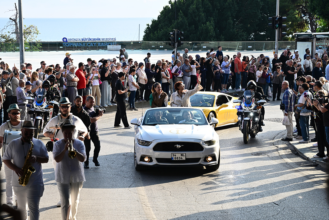 Sanatçılar, üstü açık otomobillerle halkı selamladı, hayranlarıyla fotoğraf çektirip onlara karanfil attı. Kortejde Antalya Büyükşehir Belediye Başkan Vekili Büşra Özdemir de yer aldı.