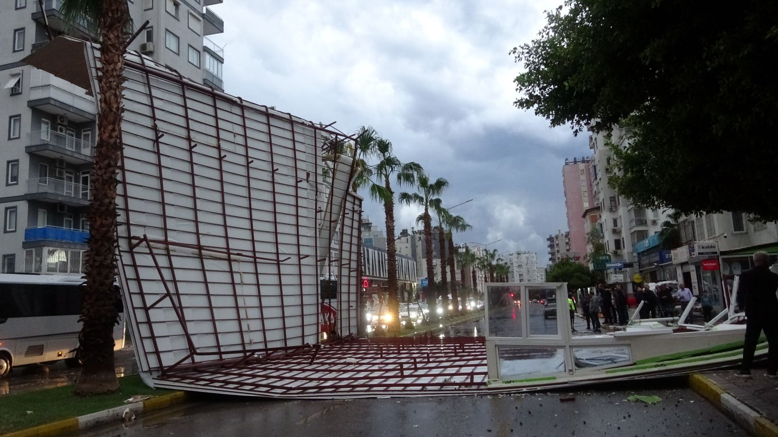 Turizm kenti Antalya'da dün akşam saatlerinde aniden bastıran ve yaklaşık 20 dakika süren şiddetli yağış ve fırtına sırasında birçok noktada hayat olumsuz etkilenmişti. Kentin farklı noktalarında fırtına nedeniyle rüzgarın şiddetine dayanamayan ağaçlar araç ve insanların üzerine devrilmişti. Muratpaşa ilçesi Meydankavağı Mahallesi Perge Bulvarı üzerinde ise bir binanın çatısında bulunan tonlarca ağırlıktaki demir profil ve PVC malzemelerden yapılan yola uçmuştu.