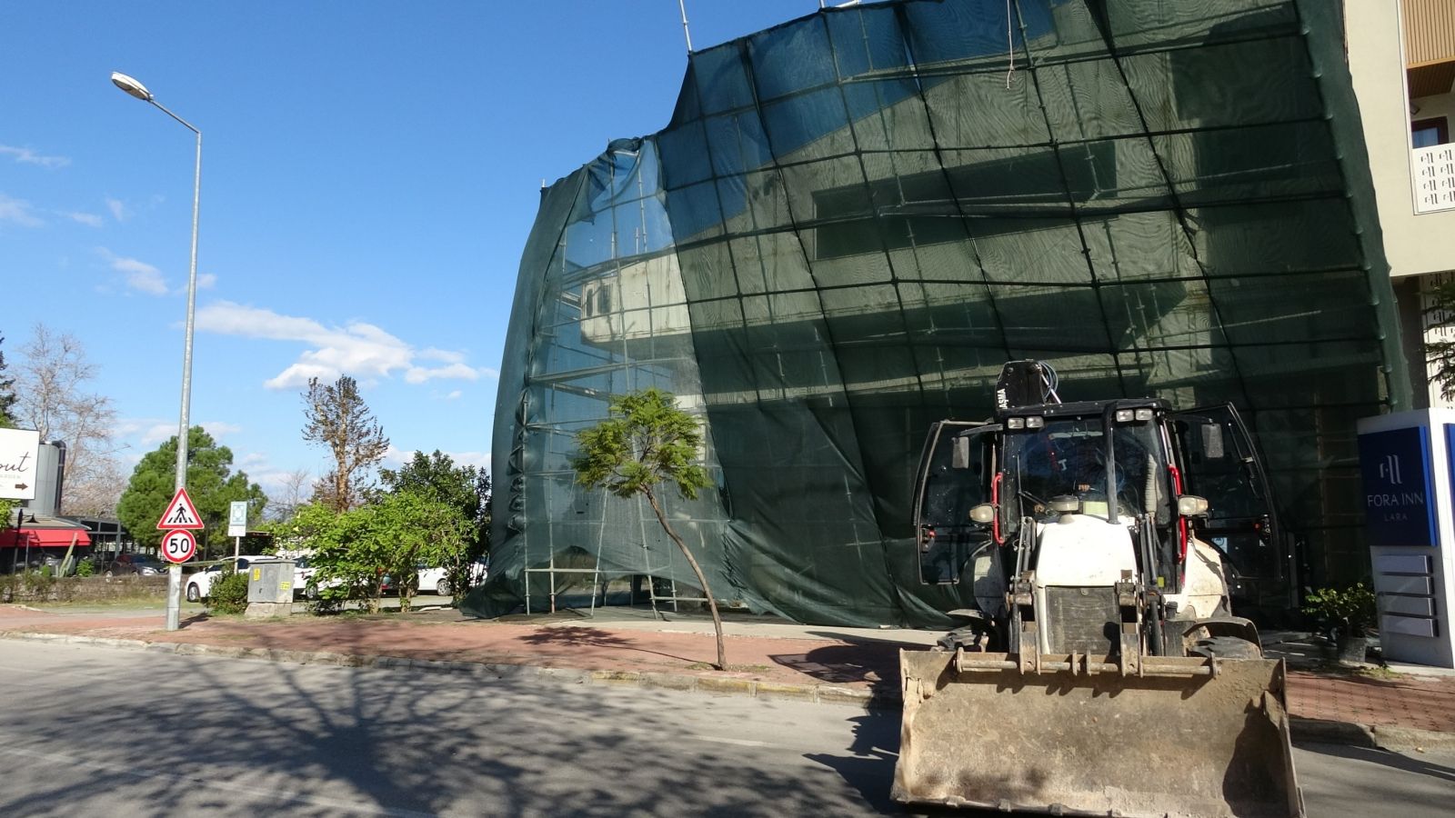 Antalya'da saatteki hızı 62 kilometreyi bulan fırtınaya dayanamayan inşaat iskelesi yerinden söküldü. Yol araç trafiğine kapatılırken, iskele iş makinesi yardımıyla yeniden sabitlendi.