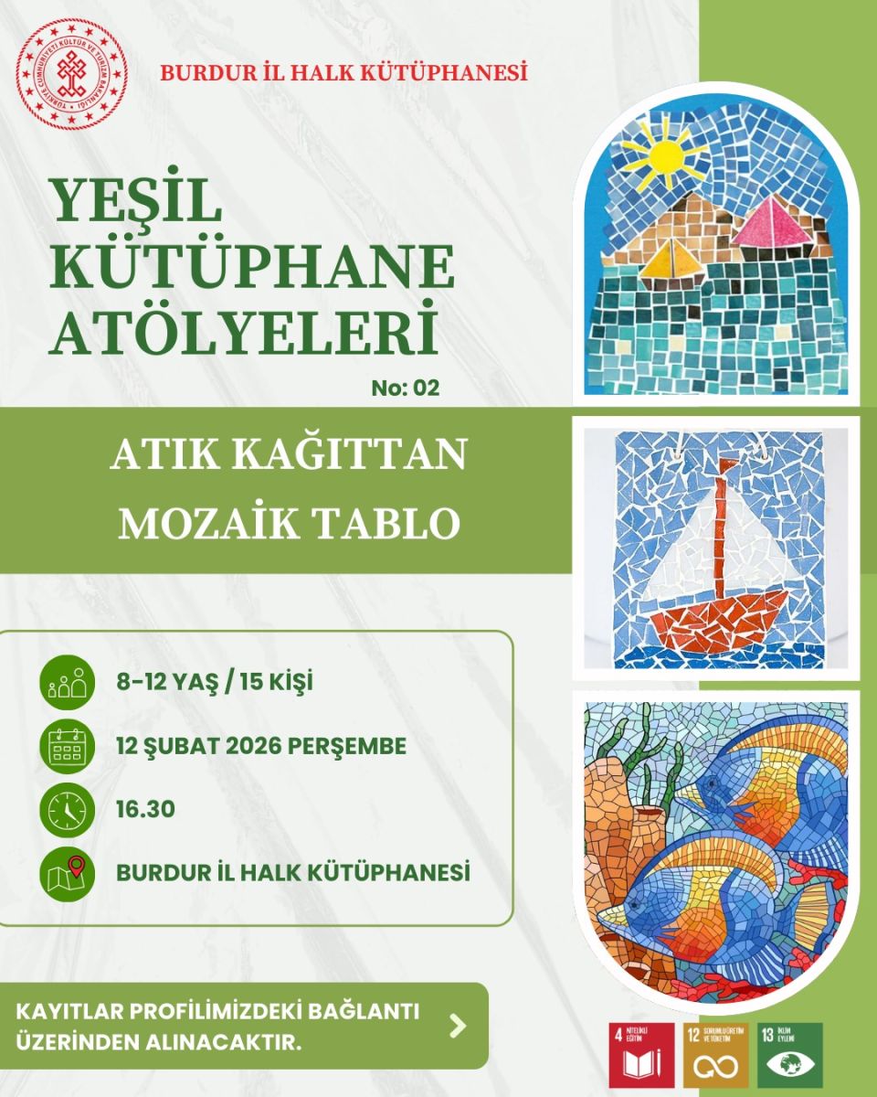 Burdur İl Halk Kütüphanesi, çocuklara yönelik “Yeşil Kütüphane Atölyeleri” kapsamında yeni bir etkinlik gerçekleştirmeye hazırlanıyor. “Atık Kağıttan Mozaik Tablo” başlığıyla düzenlenecek atölye çalışması, geri dönüşüm bilincini artırmayı ve çocukların el becerilerini geliştirmeyi amaçlıyor.