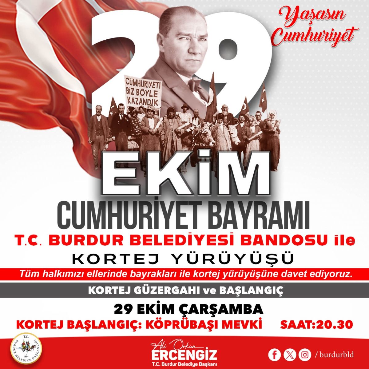 Program kapsamında, Burdur Belediyesi Bandosu eşliğinde kortej yürüyüşü gerçekleştirilecek. Yürüyüş, 29 Ekim Çarşamba günü saat 20.30’da Köprü Başı Mevkii’nden başlayacak ve Cumhuriyet Meydanı’nda sona erecek. Etkinliğe katılacak vatandaşlar, ellerinde Türk bayraklarıyla Cumhuriyet coşkusuna ortak olacak.