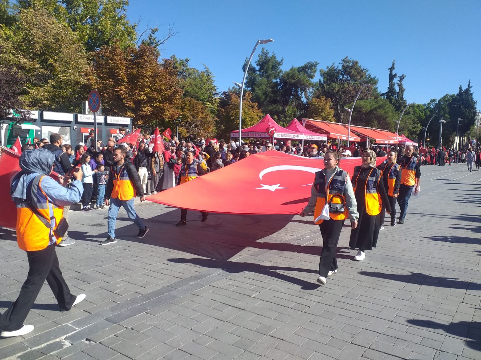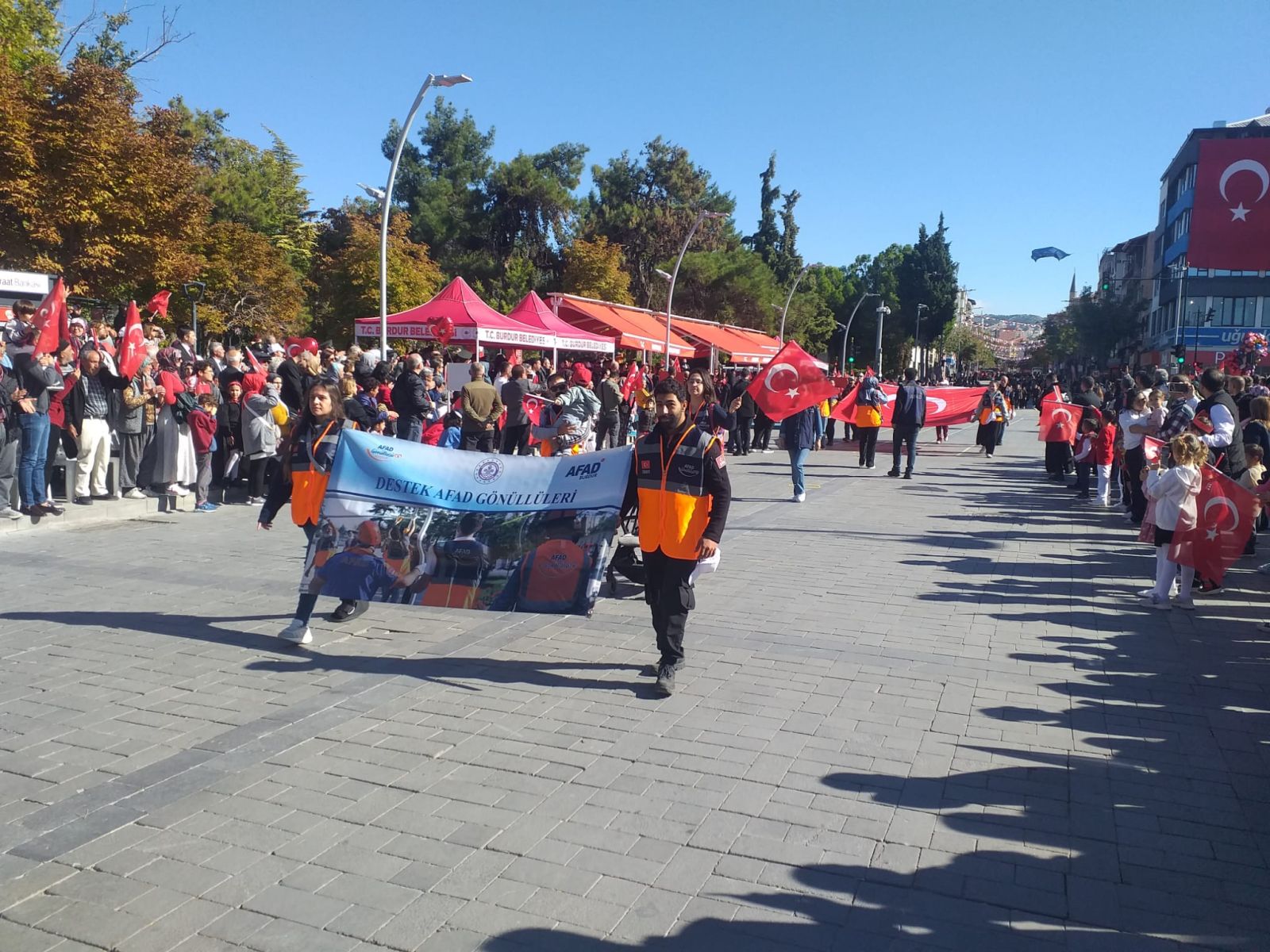 Burdur – 29 Ekim Cumhuriyet Bayramı kutlamaları kapsamında düzenlenen kortej yürüyüşüne, Burdur İl Afet ve Acil Durum Müdürlüğü (AFAD) personeli ile Destek AFAD Gönüllüleri de katıldı.