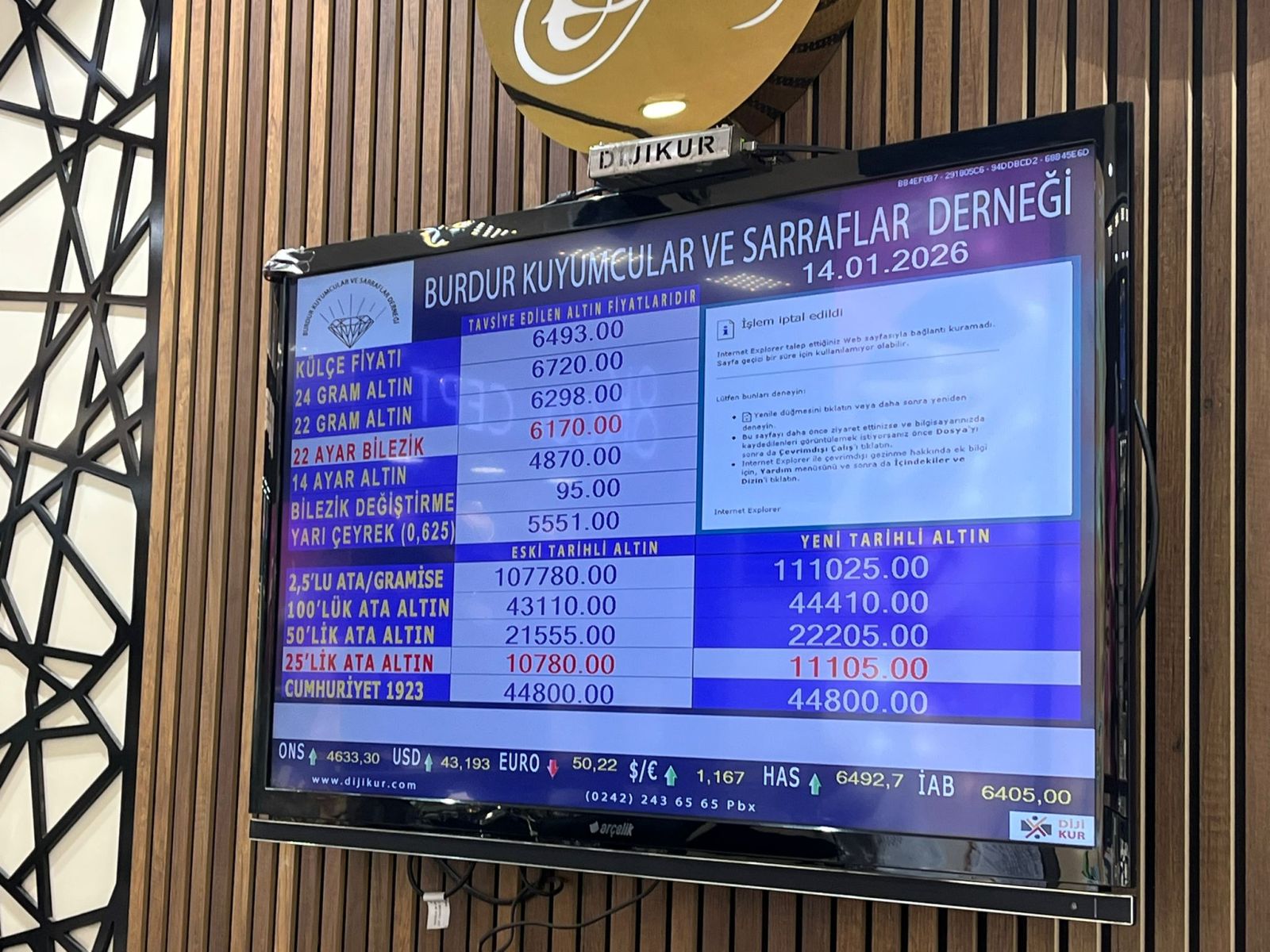 Burdur Kuyumcular ve Sarraflar Derneği tarafından 14 Ocak 2026 Çarşamba günü saat 09.00 itibarıyla güncel altın fiyatları şu şekilde: