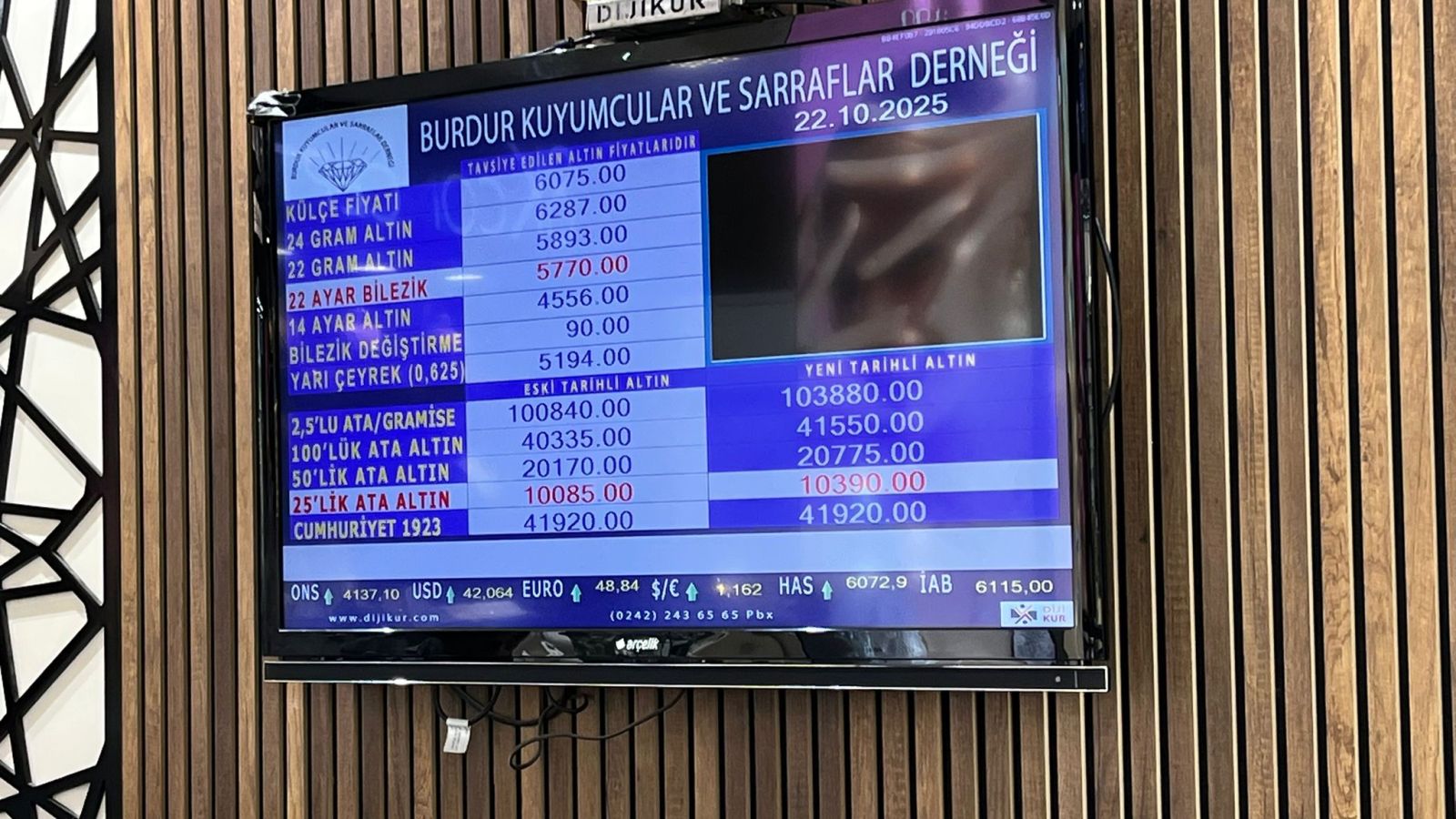 Burdur Kuyumcular ve Sarraflar Derneği tarafından 22 Ekim 2025 Çarşamba günü saat 09.00 itibarıyla güncel altın fiyatları şu şekilde: