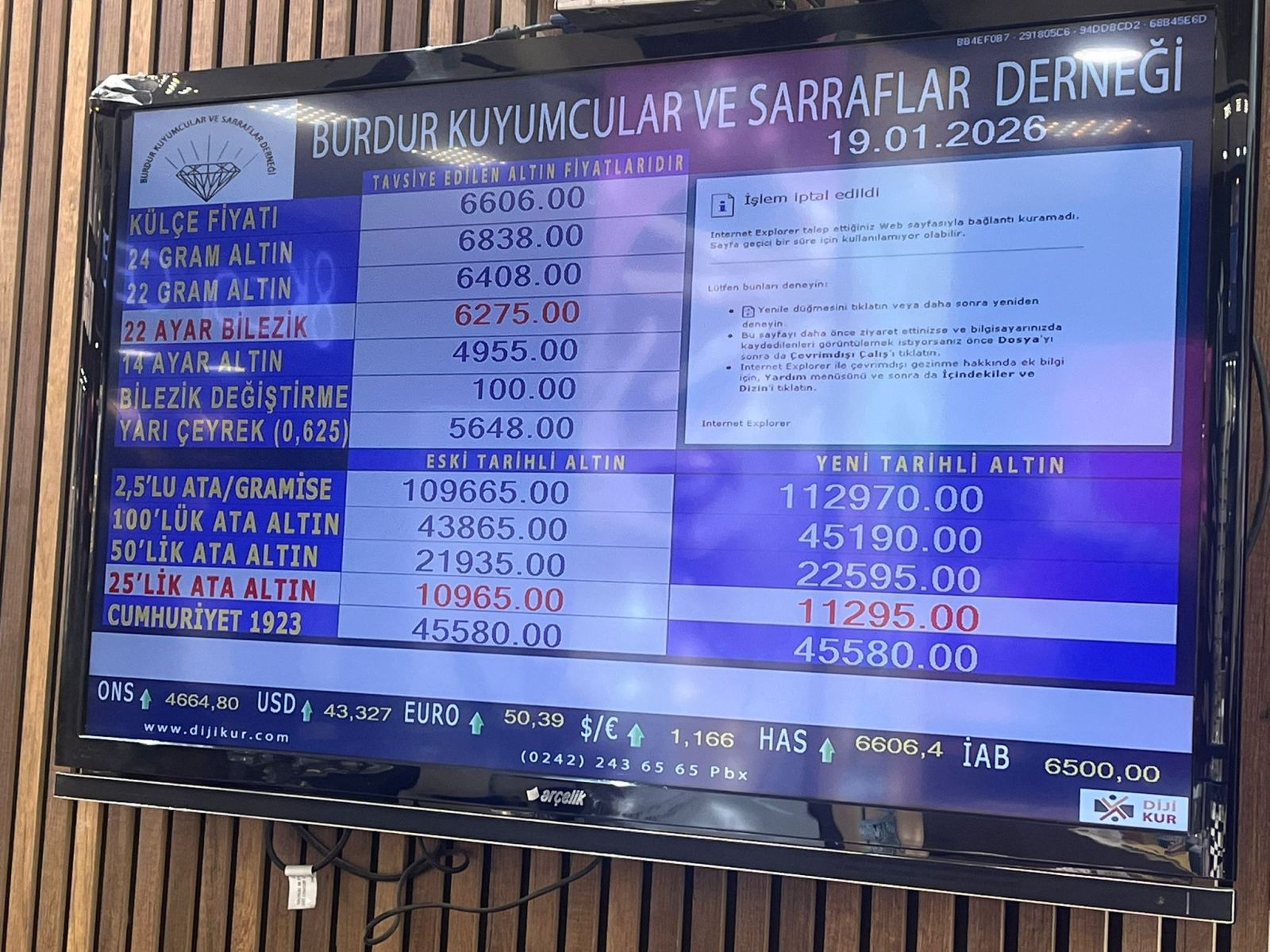 Burdur Kuyumcular ve Sarraflar Derneği tarafından 19 Ocak 2026 Pazartesi günü saat 09.00 itibarıyla güncel altın fiyatları şu şekilde: