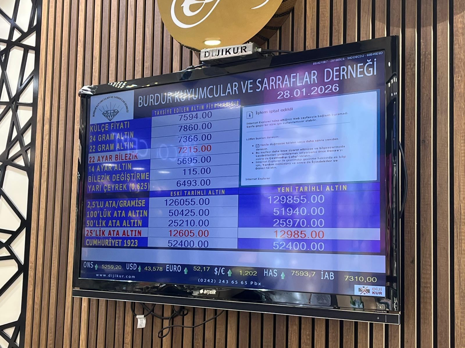 Burdur Kuyumcular ve Sarraflar Derneği tarafından 28 Ocak 2026 Çarşamba günü saat 09.00 itibarıyla güncel altın fiyatları şu şekilde: