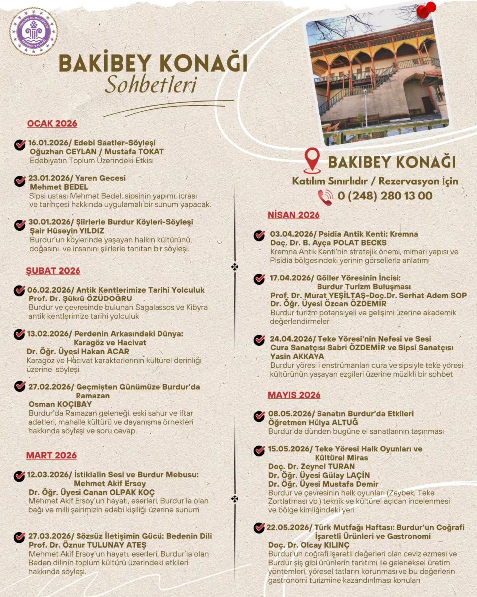 Burdur Valiliği öncülüğünde düzenlenen Bakibey Konağı Sohbetleri, 16 Ocak 2026 Cuma günü başlıyor. Katılımın sınırlı olacağı etkinlikler için rezervasyon yaptırmak isteyen vatandaşlar, 0 (248) 280 13 00 numaralı telefondan bilgi alabilecek.