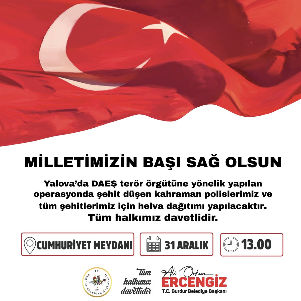 Burdur Belediye Başkanı Ali Orkun Ercengiz imzası ile yayınlanan davetiyede: “Yalova’da DEAŞ terör örgütüne yönelik yapılan operasyonda şehit düşen kahraman polislerimiz ve tüm şehitlerimiz için 31 Ocak 2025 Çarşamba günü saat 13.00’da Burdur Cumhuriyet meydanında helva dağıtımı yapılacaktır. Tüm halkımız davetlidir.” denildi.