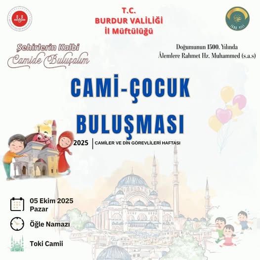 Camiler ve Din Görevlileri Haftası kutlamaları başladı. Burdur İl Müftülüğü hafta dolayısı ile 5 ekim 2025 Pazar günü Bozkurt Mahallesi’ndeki TOKİ Camii’nde öğle namazında ‘Cami Çocuk Buluşması’ programı tertip etti.