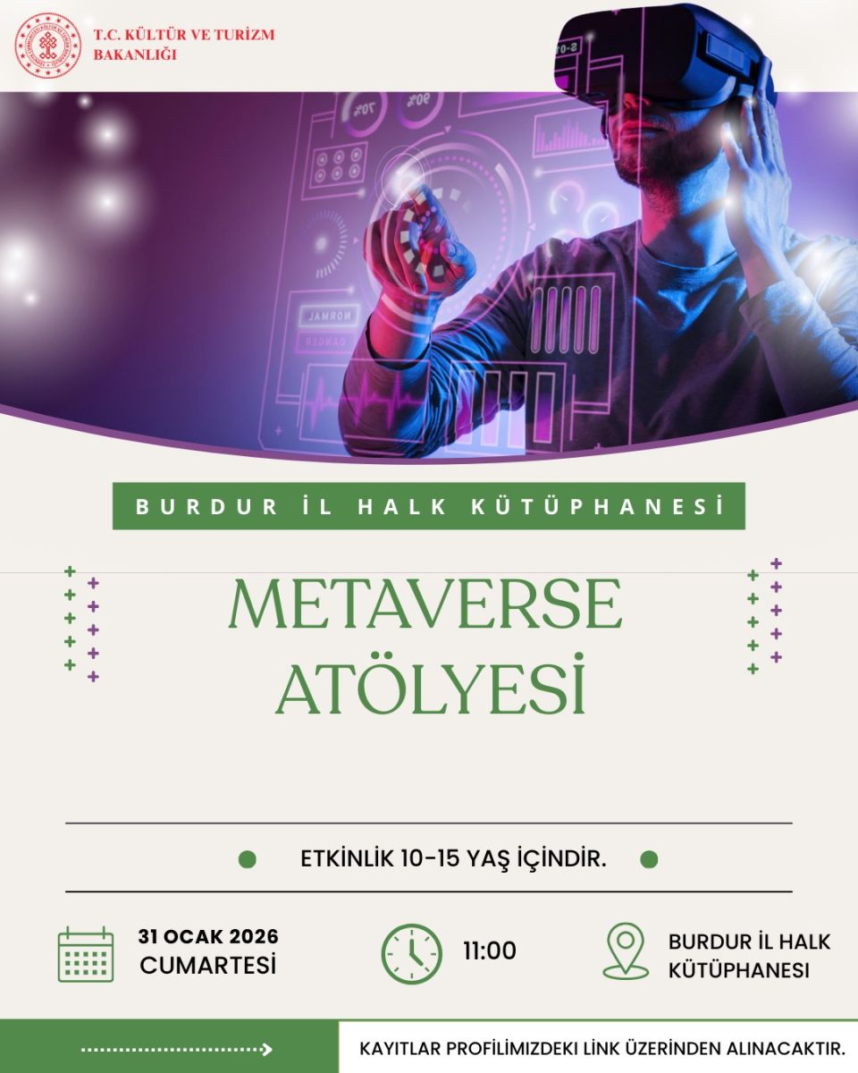 Burdur İl Halk Kütüphanesi, teknolojiye ilgi duyan çocuklara metaverse dünyasıyla tanıştıracak bir etkinliğe ev sahipliği yapıyor. 10–15 yaş grubuna yönelik düzenlenen Metaverse Atölyesi, 31 Ocak 2026 Cumartesi günü saat 11.00’de gerçekleştirilecek.