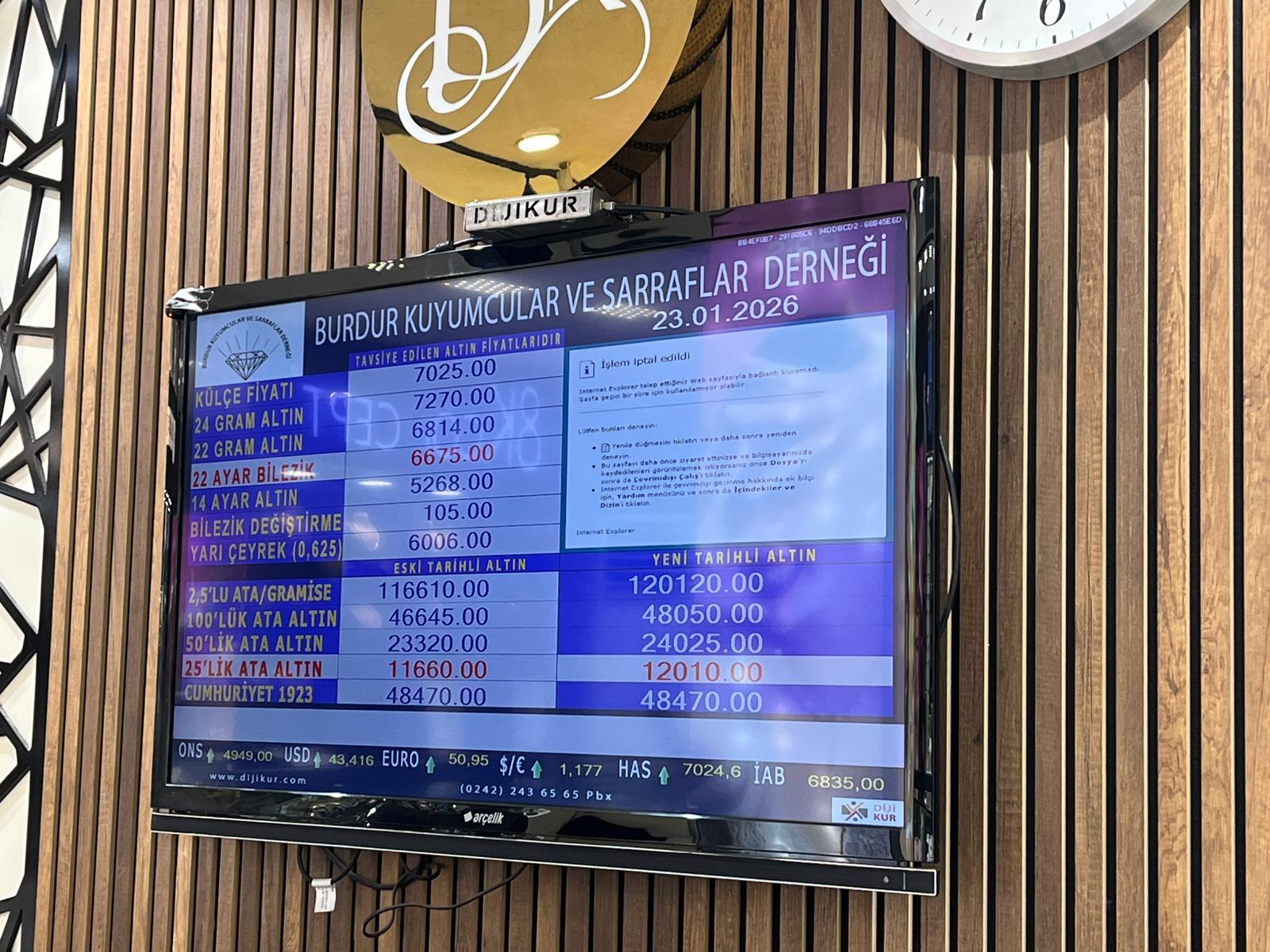 Burdur Kuyumcular ve Sarraflar Derneği tarafından 23 Ocak 2026 Cuma günü saat 09.00 itibarıyla güncel altın fiyatları şu şekilde: