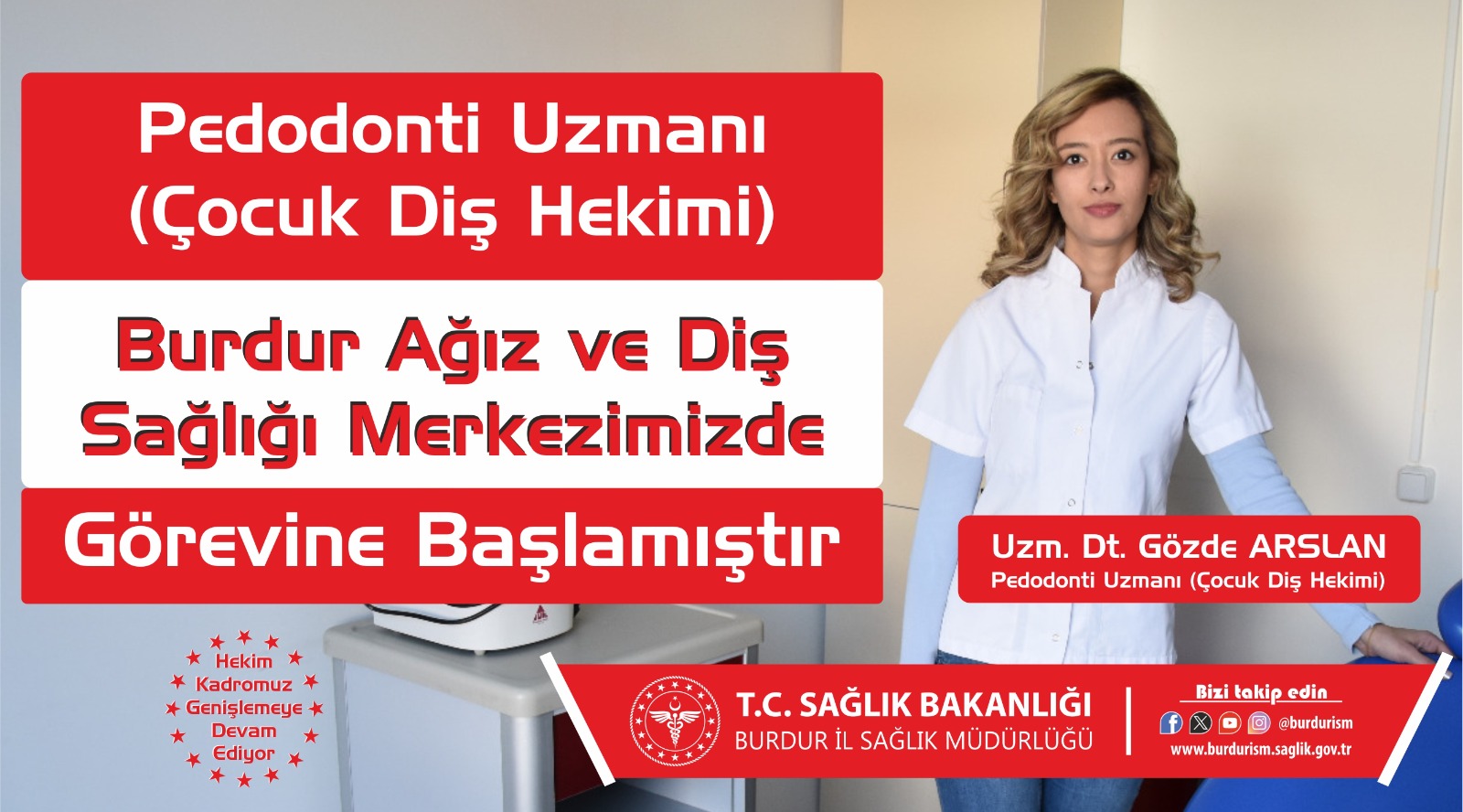 Uzm. Dt. Gözde Arslan, 24 Kasım 2025 tarihinden itibaren çocuk hastaların ağız ve diş sağlığını koruma, tedavi ve gelişim süreçlerini takip etme görevini üstlenecek. Uzman kadronun Pedodonti alanında güçlenmesi, Burdur halkına sunulan çocuk diş sağlığı hizmetlerinin niteliğini artıracak ve daha kapsamlı bir sağlık hizmeti sunulmasına katkı sağlayacak.