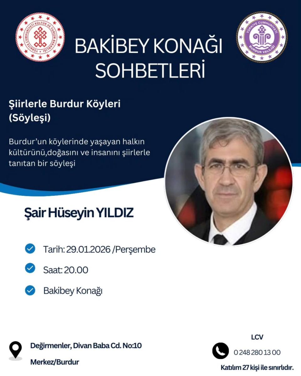 Katılımın 27 kişi ile sınırlı olduğu söyleşi, 29 Ocak 2026 Perşembe günü saat 20.00’de Bakibey Konağı’nda ücretsiz olarak yapılacak. Kültür ve Turizm İl Müdürlüğü, Burdur’un kültürel mirasına ve yerel değerlerine şiirle ışık tutacak bu etkinliğe tüm vatandaşları davet etti.