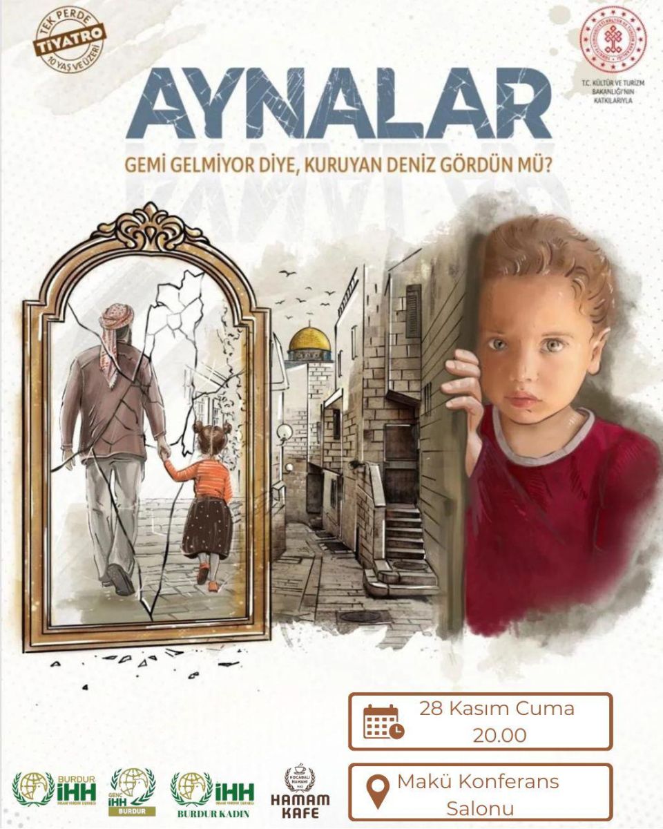 Burdur’da anlamlı bir tiyatro etkinliği sanatseverlerle buluşuyor. Kültür ve Turizm Bakanlığı’nın destekleriyle hazırlanan “Aynalar” adlı tek perdelik tiyatro oyunu, 28 Kasım Cuma günü saat 20.00’de MAKÜ Konferans Salonu’nda sahnelenecek.