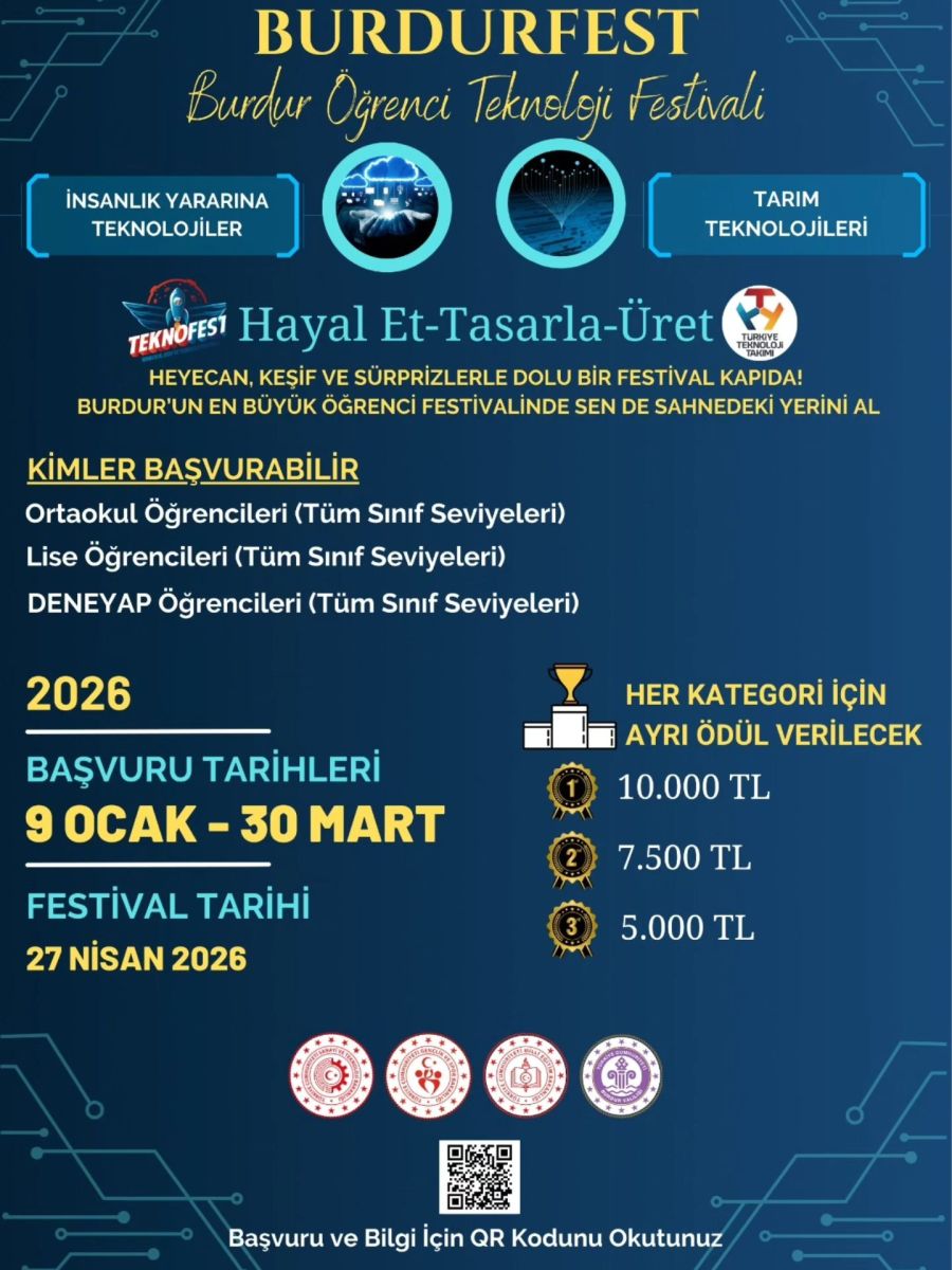 BURDURFEST Burdur Öğrenci Teknoloji Festivalinin 9 Ocak 2026 tarihinde başlayan başvurular 30 Mart 2026 tarihinde son bulacak. Festival ise 27 Nisan 2026 tarihinde yapılacak. Festivalde gençler “Hayal Et • Tasarla • Üret” sloganı ile projelerini hayata geçirecek, teknoloji alanında yeteneklerini sergileme fırsatı bulacak.