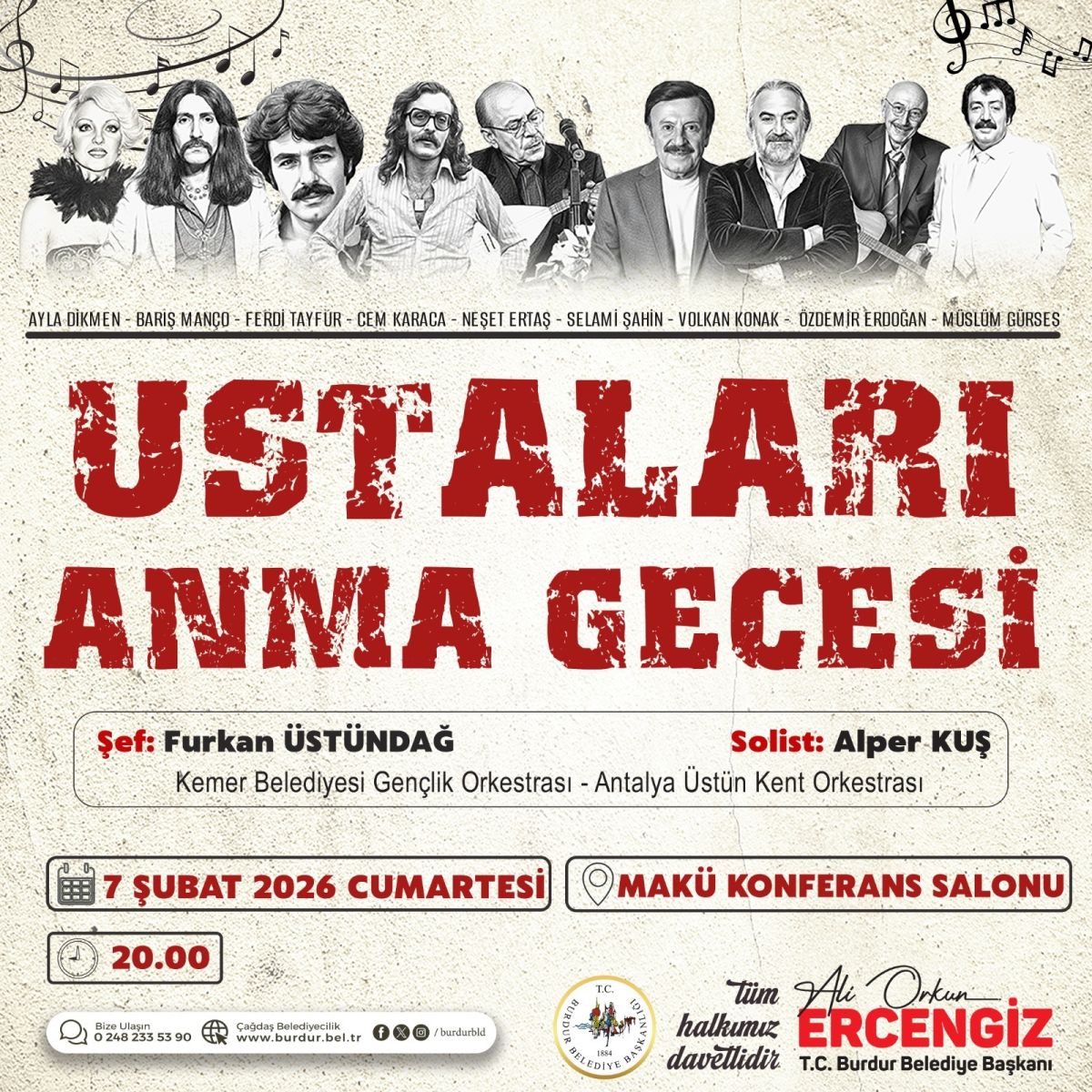 “Ustaları Anma Gecesi” etkinliği, 7 Şubat 2026 Cumartesi günü saat 20.00’de, Mehmet Akif Ersoy Üniversitesi (MAKÜ) Konferans Salonu’nda gerçekleştirilecek. Türk müziğinin hafızalara kazınan eserlerinin seslendirileceği gece, Burdur’da kültür ve sanat dolu bir akşam yaşatacak.