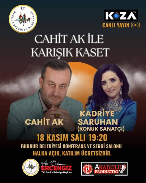 Burdur Belediyesi, sevilen program “Cahit Ak ile Karışık Kaset” için özel bir etkinliğe ev sahipliği yapacak. Programın sunucusu Cahit Ak’ın konuk sanatçı olarak Kadriye Saruhan’ı ağırlayacağı buluşma, 18 Kasım Salı günü saat 19.20’de Burdur Belediyesi Konferans ve Sergi Salonu’nda gerçekleştirilecek.