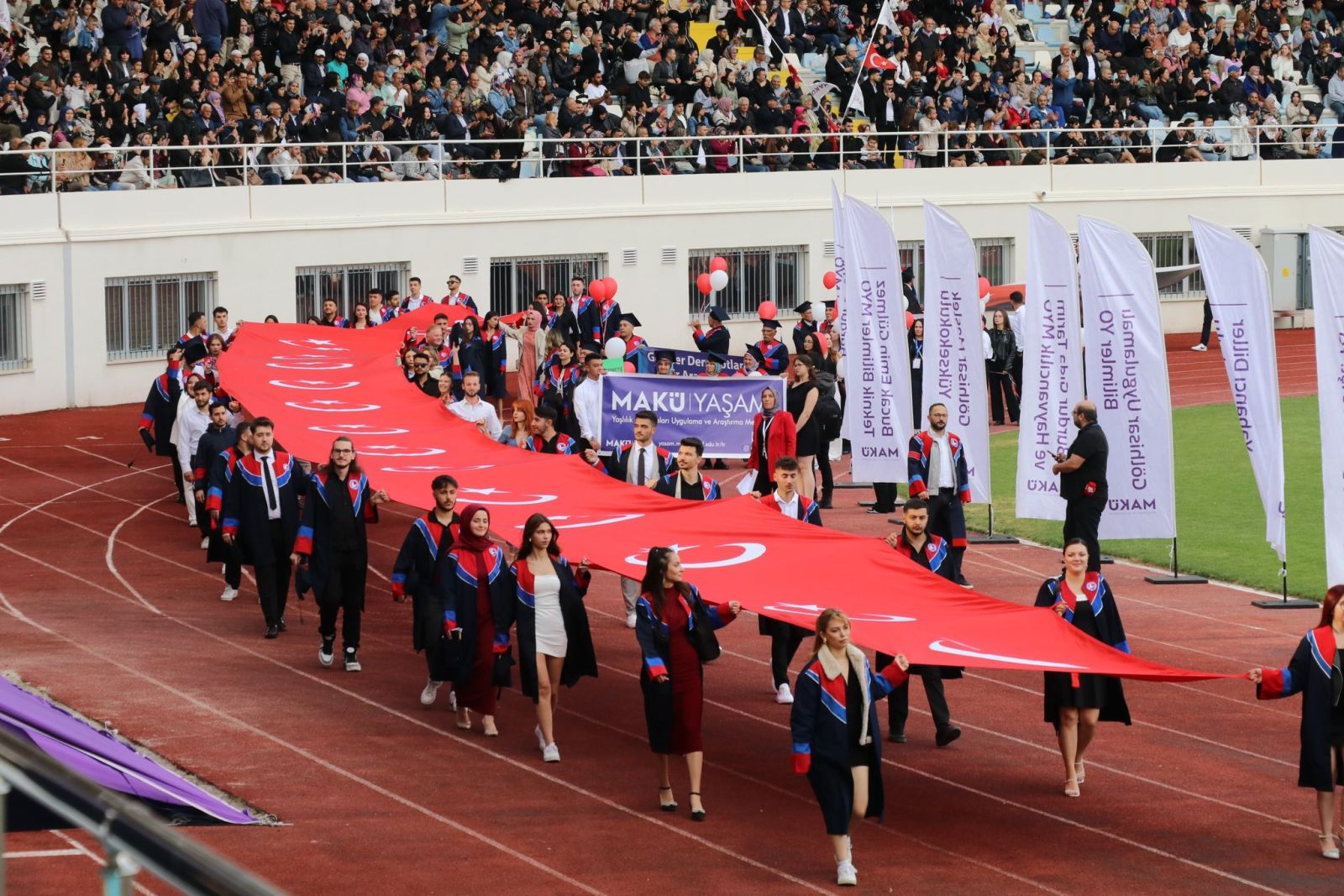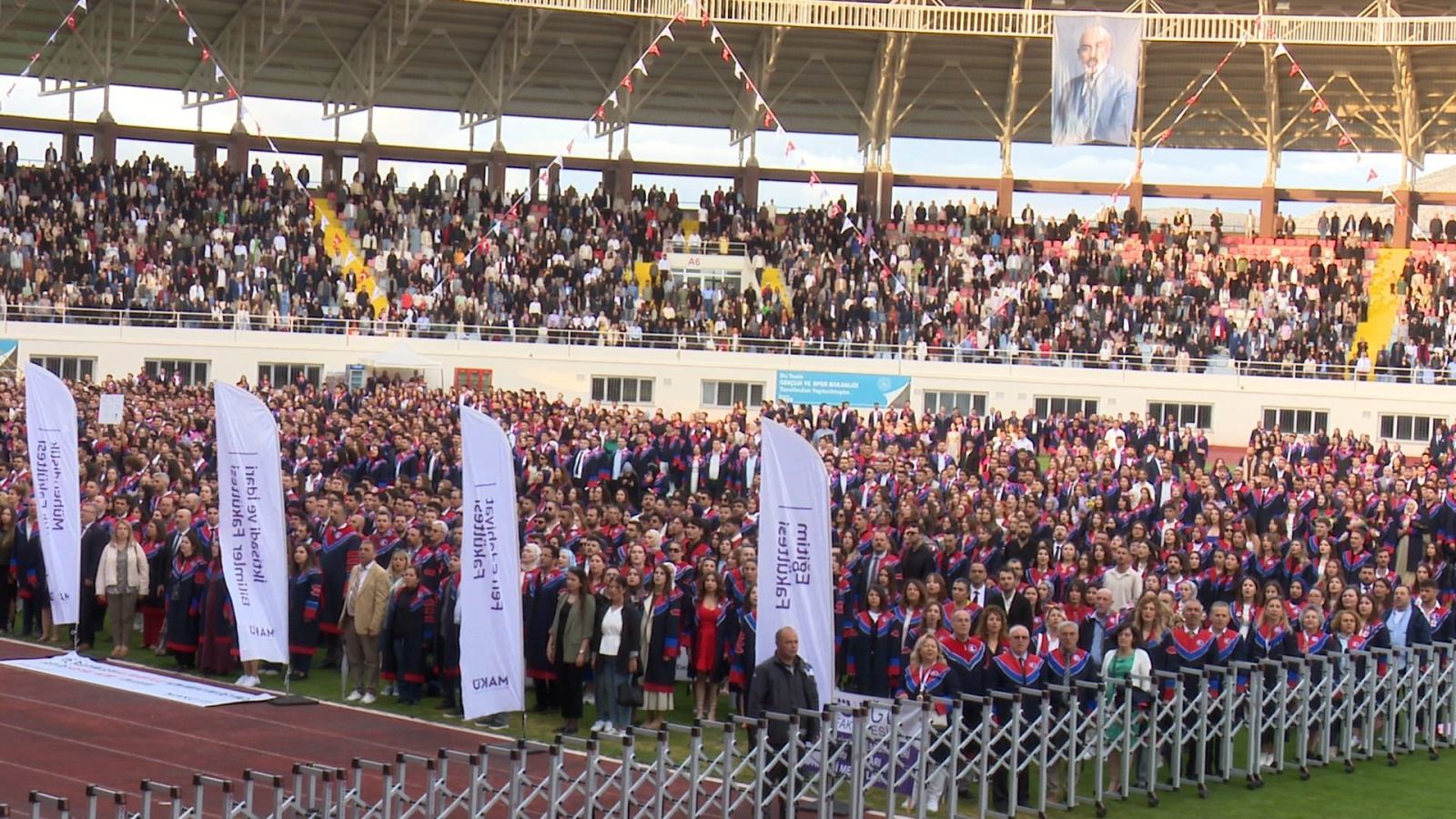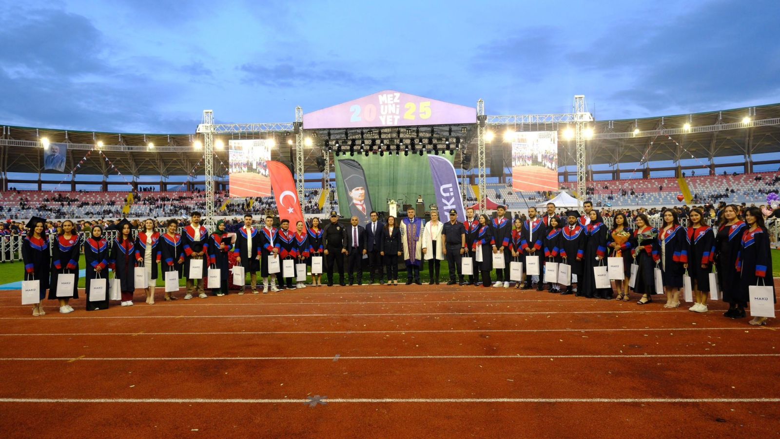 Yoğun katılımla gerçekleşen törende mezuniyet coşkusu yaşanırken, öğrenciler keplerini havaya fırlatarak üniversite hayatlarını uğurladı.