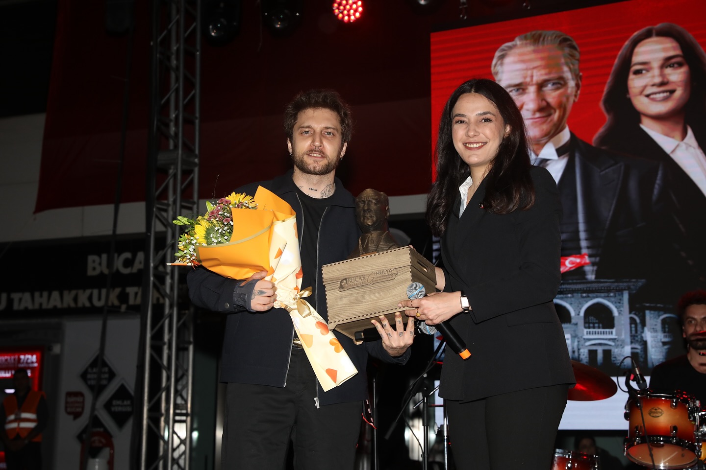 Konserde Bucak Belediye Başkanı Hülya Gümüş tarafından ünlü sanatçı Ufuk Beydemir’e çiçek ve Atatürk Büstü takdim edildi.