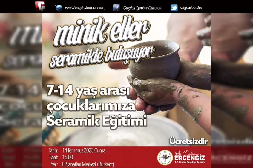 Burdur Belediyesi Seramik Sanat Tasarım Eğitim ve Uygulama Merkezi Atölyesi tarafından ücretsiz düzenlenen çocuklara yönelik “Minik eller Seramikle Buluşuyor” eğitim programı 14 Temmuz 2023 Cuma günü saat 16.00’da başlayacağı bildirildi. Burdur Belediyesi basın bürosundan yapılan yazılı açıklamada: “Burdur Belediyesi Seramik Sanat Tasarım Eğitim ve Uygulama Merkezi Atölyesi tarafından her yıl ücretsiz düzenlenen çocuklara yönelik “Minik eller Seramikle Buluşuyor” eğitim programı 14 Temmuz 2023 Cuma günü Saat:16.00’da Burdur Belediyesi El Sanatları Merkezinde 4. Dönem açılışı yapılacak. 7-14 yaş grubu çocuklar için kayıt alınacaktır. Tüm halkımız davetlidir.” denildi.
