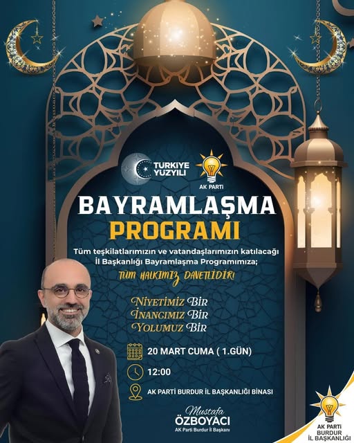 AK Parti Burdur İl Başkanı Mustafa Özboyacı, Ramazan Bayramı dolayısıyla düzenlenecek bayramlaşma programını kamuoyuyla paylaştı. Parti teşkilatları ve vatandaşların katılımıyla gerçekleşecek program için tüm Burdurlular davet edildi.