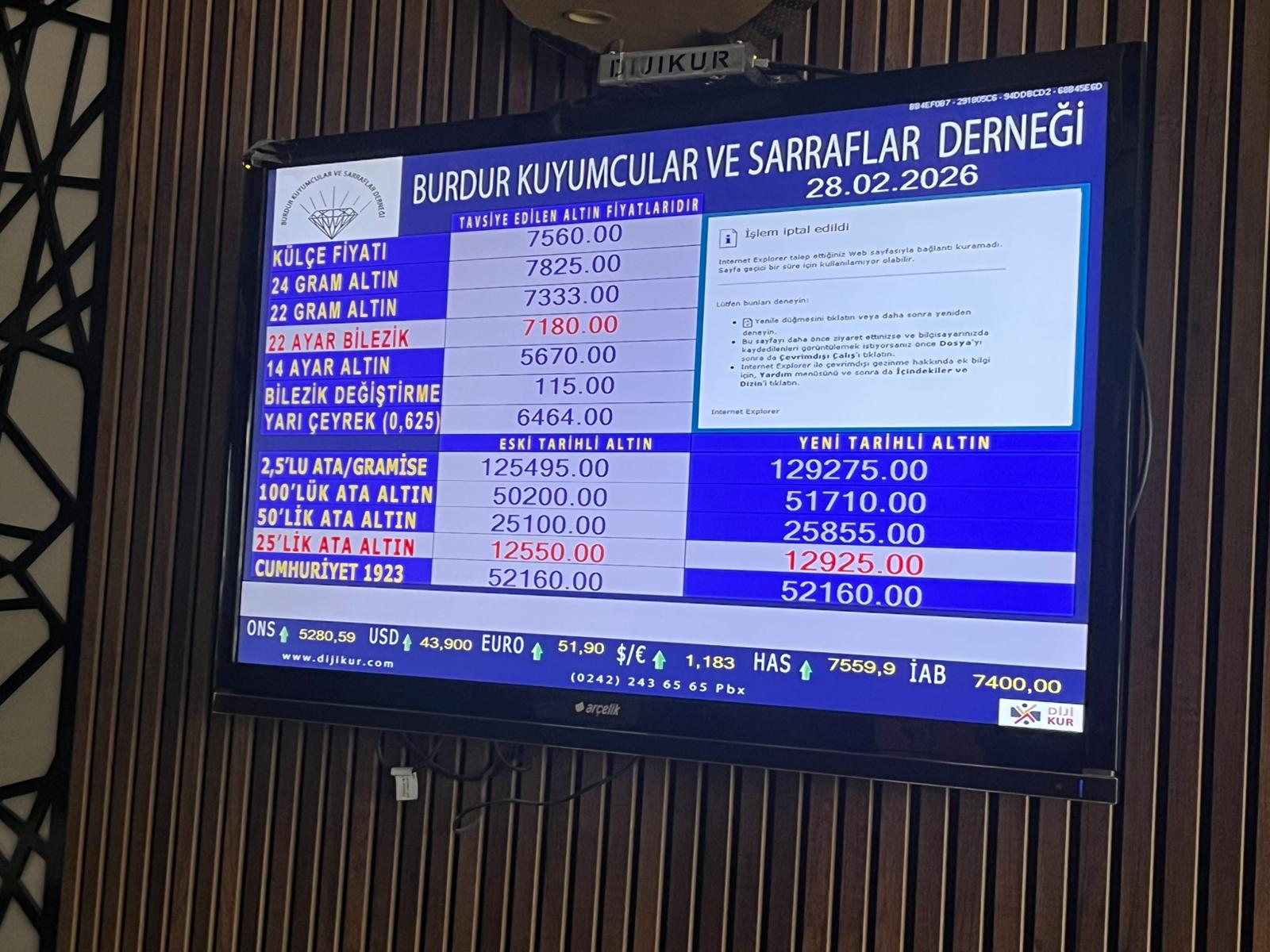 Burdur Kuyumcular ve Sarraflar Derneği tarafından 28 Şubat 2026 Cumartesi günü saat 09.00 itibarıyla güncel altın fiyatları şu şekilde: