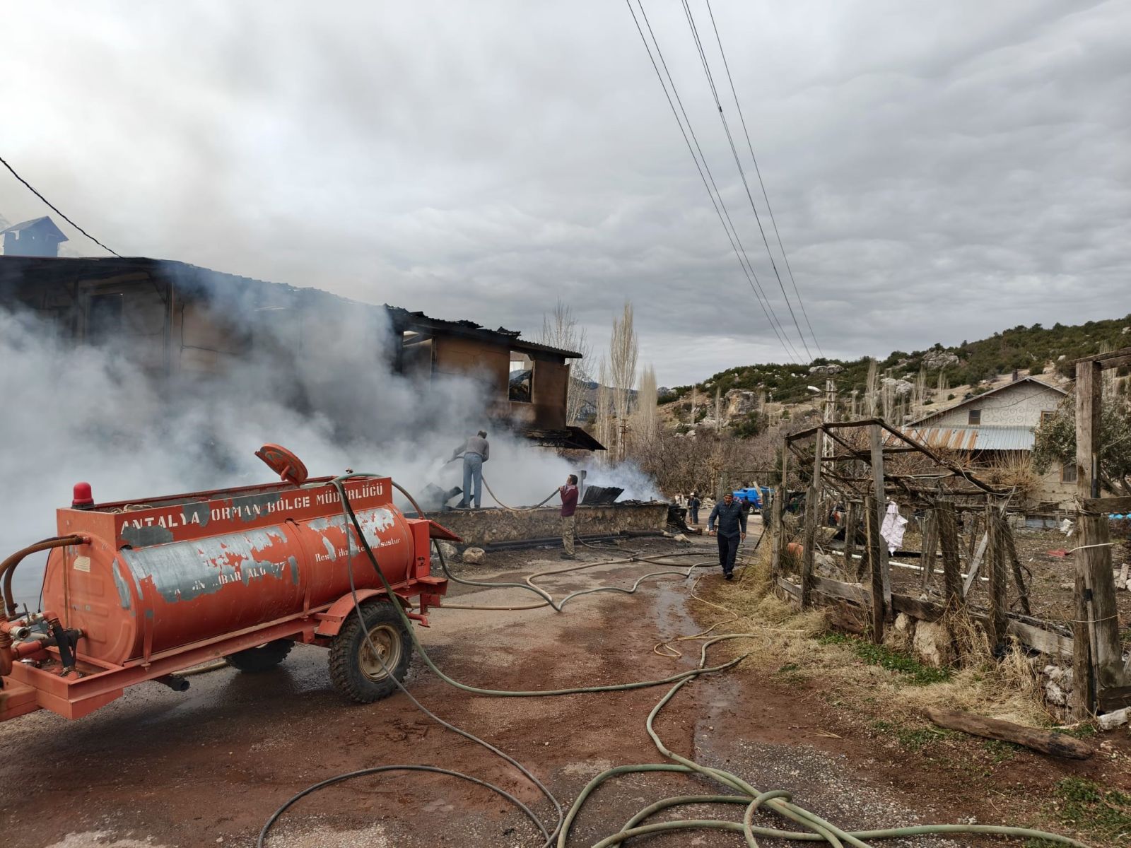 Çobanların ihbarı üzerine bölgeye itfaiye ve orman ekipleri yönlendirilirken, Antalya Büyükşehir Belediyesi'ne ait itfaiye aracının, olay yerine 35 kilometre mesafedeki Ortaköy Mahallesi altında arıza yapması müdahaleyi geciktirdi. Alevlere ilk müdahaleyi Orman İşletme Müdürlüğü'ne ait yangın araçları yaparak soğutma çalışması gerçekleştirdi. Evleri tamamen yanan ve eşyaları kül olan aileye komşuları yardımcı oldu.