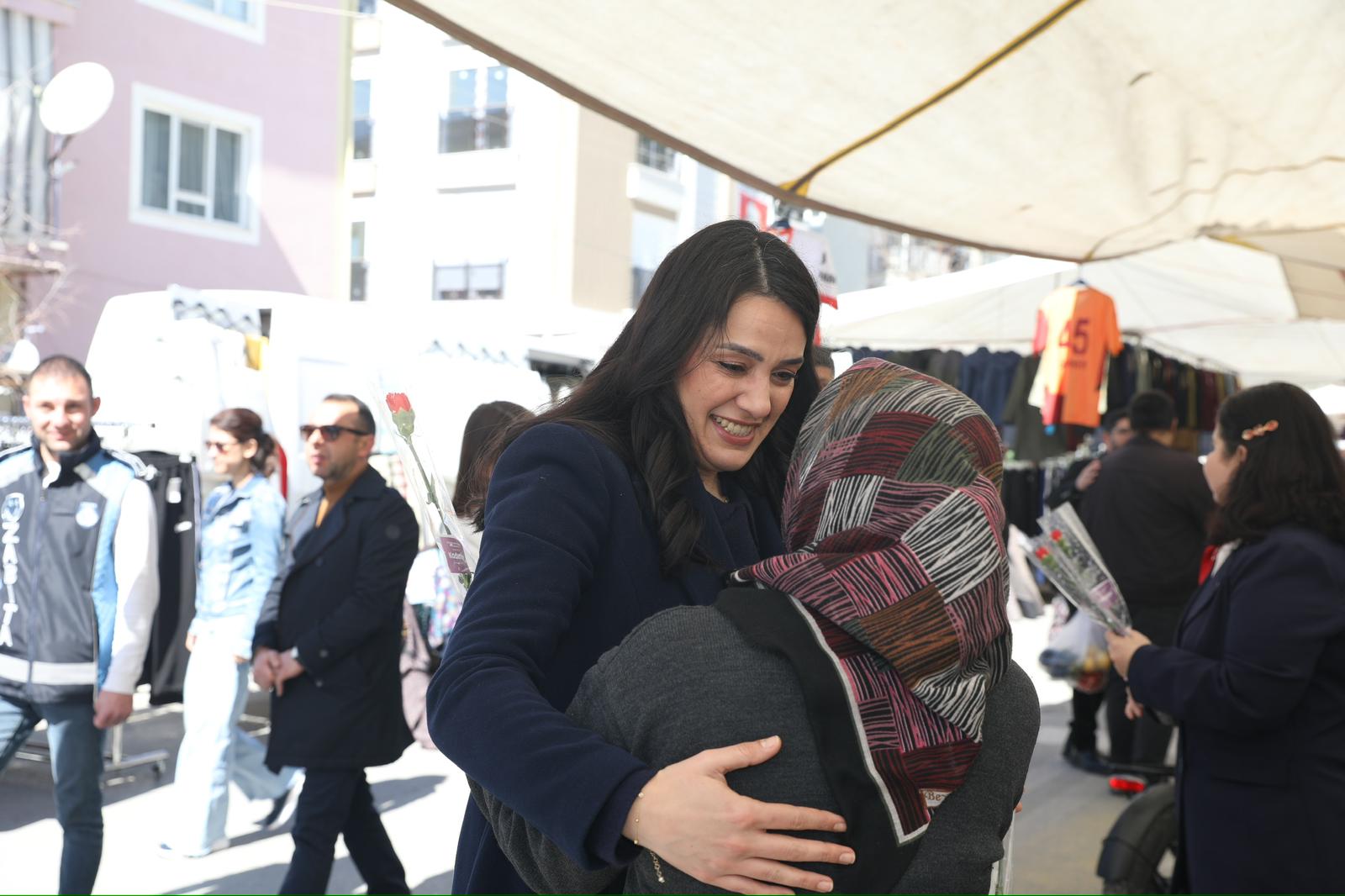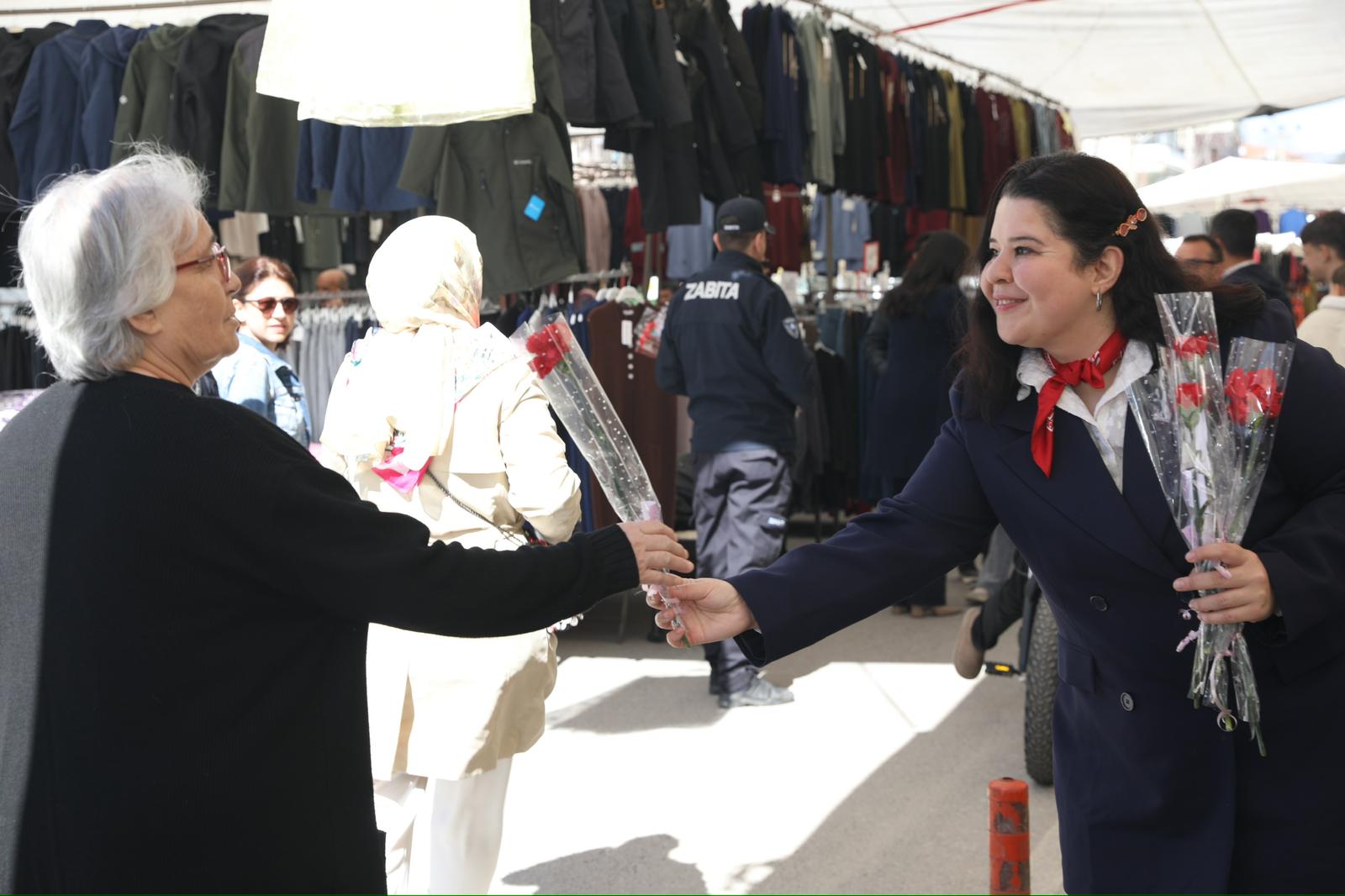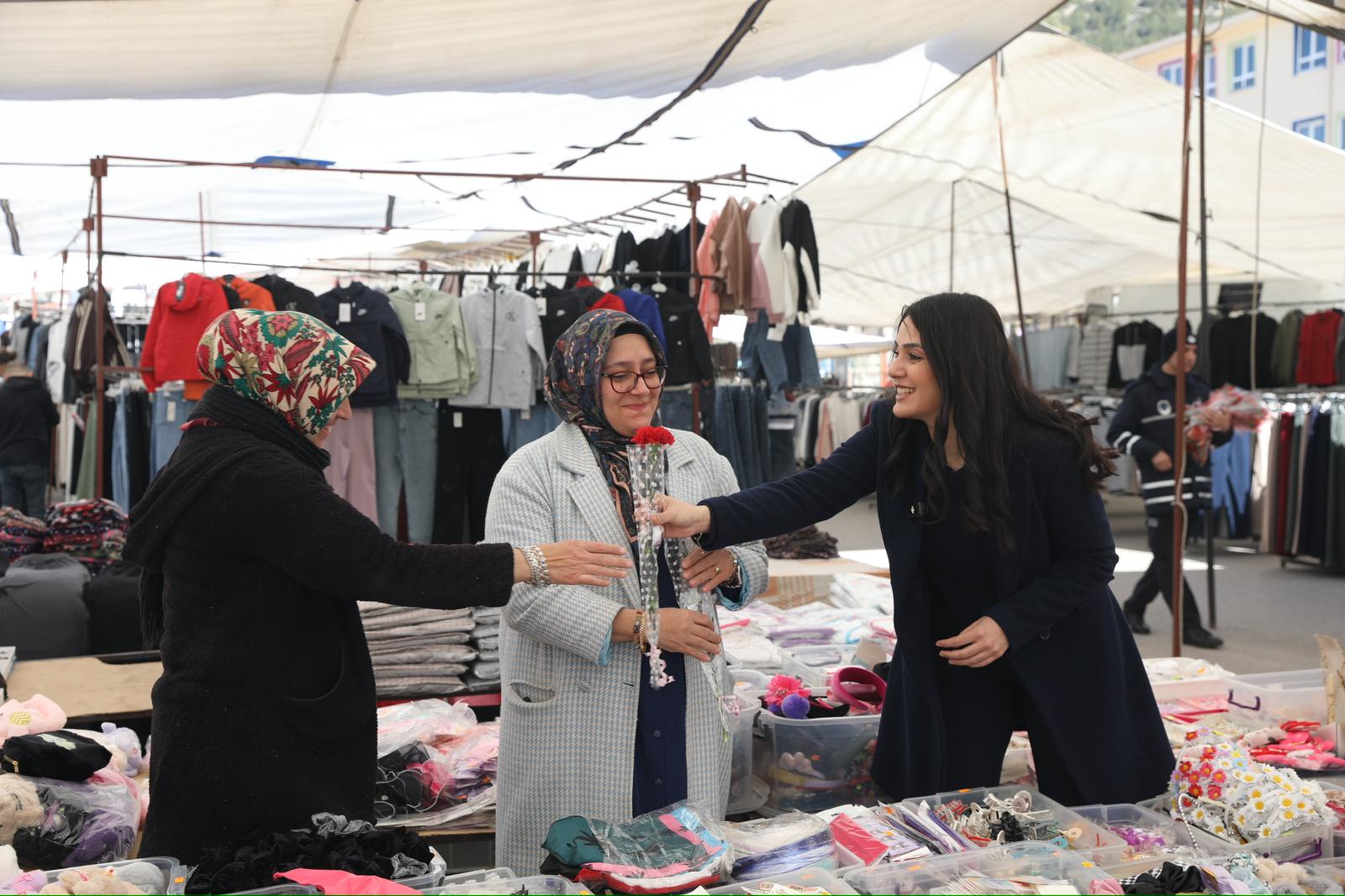 Pazar yerinde kadın esnaflar ve vatandaşlarla sohbet eden Başkan Gümüş, kadınların emekleri ve topluma kattıkları değerin önemine dikkat çekti.