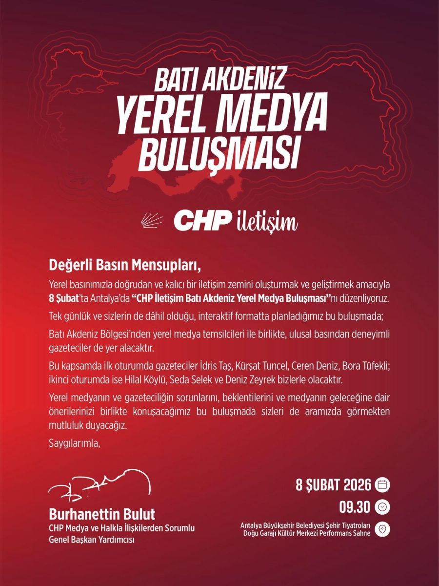 CHP İletişim tarafından düzenlenen Batı Akdeniz Yerel Medya Buluşması, 8 Şubat Pazar günü Antalya’da gerçekleştirilecek. Etkinlikte yerel ve dijital gazetecilik, panel ve söyleşilerle ele alınacak.