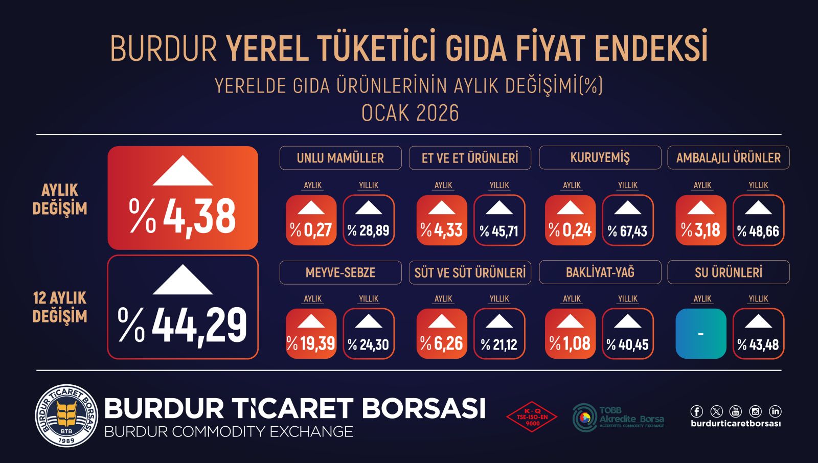 Burdur Ticaret Borsası tarafından hazırlanan Yerel Tüketici Gıda Fiyat Endeksi’ne göre, Ocak ayında gıda artışı bir önceki aya kıyasla yüzde 4,38 olarak hesaplandı. Burdur’da gıda fiyatlarının 2025 Ocak ayına göre 12 aylık dönemde artışı ise yüzde 44,29 oranında gerçekleşti.