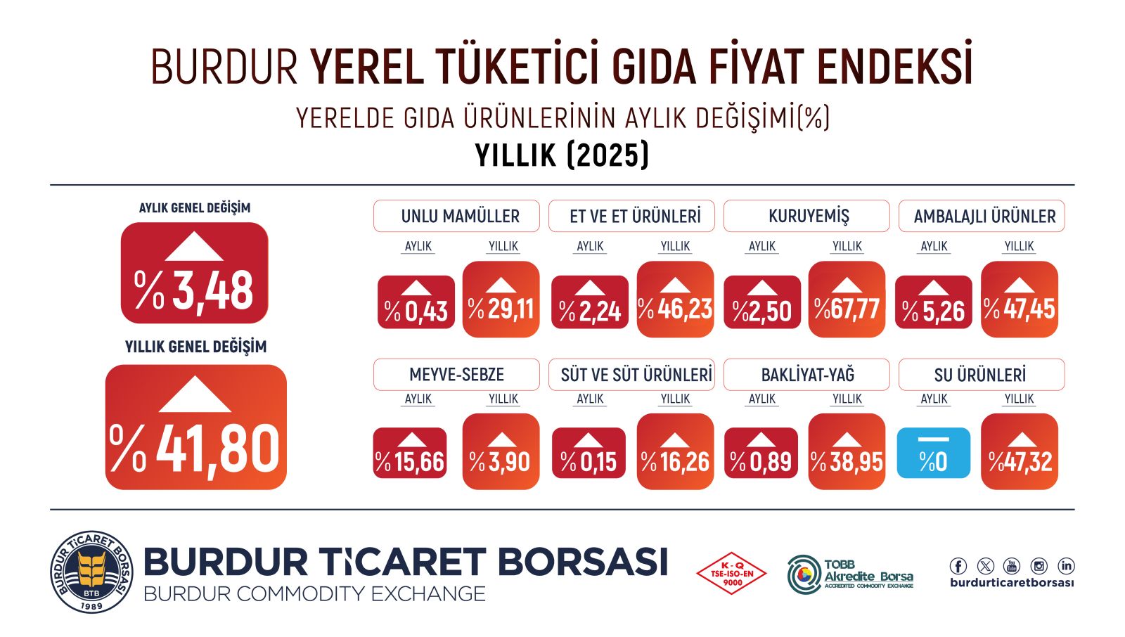 Burdur Ticaret Borsası’nın yerel piyasa koşullarını esas alarak oluşturduğu endeks çalışması kapsamında; 8 ana gıda grubu altında yer alan 106 farklı gıda kaleminde toplam 422 ürünün fiyatı dikkate alınarak hesaplama yapıldı. Elde edilen veriler, 2025 yılı boyunca gıda fiyatlarında yaşanan değişimi net bir şekilde ortaya koydu.