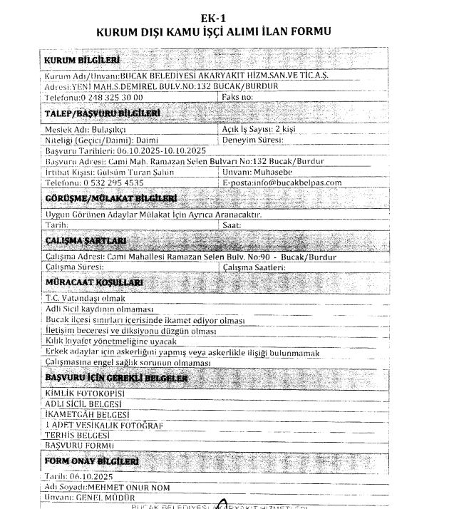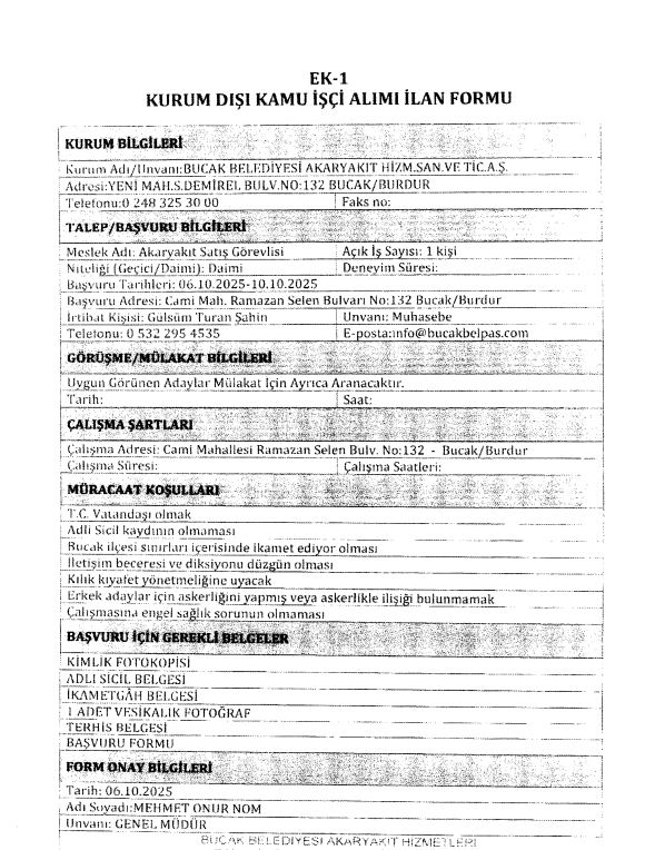 Bucak Belediyesi bünyesinde çalıştırmak üzere 6 kişiyi istihdam edecek.