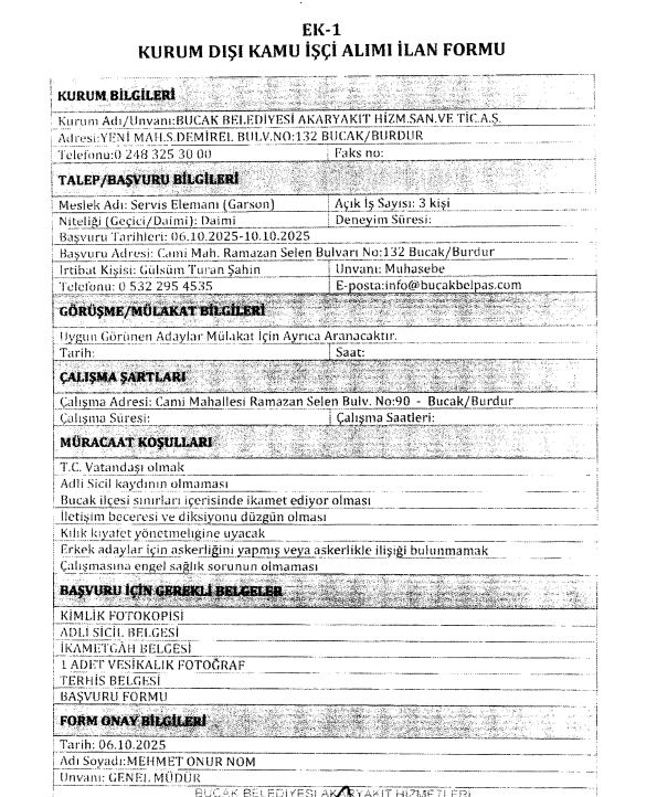 Bucak Belediyesi bünyesinde çalıştırmak üzere, 3 servis elemanı (garson), 1 akaryakıt satış görevlisi, 2 bulaşıkçı olmak üzere 6 kişiyi iş sahibi yapacak. 6 Ekim 2025 Pazartesi günü başlayan başvurular, 10 Ekim 2025 Cuma günü son bulacak.