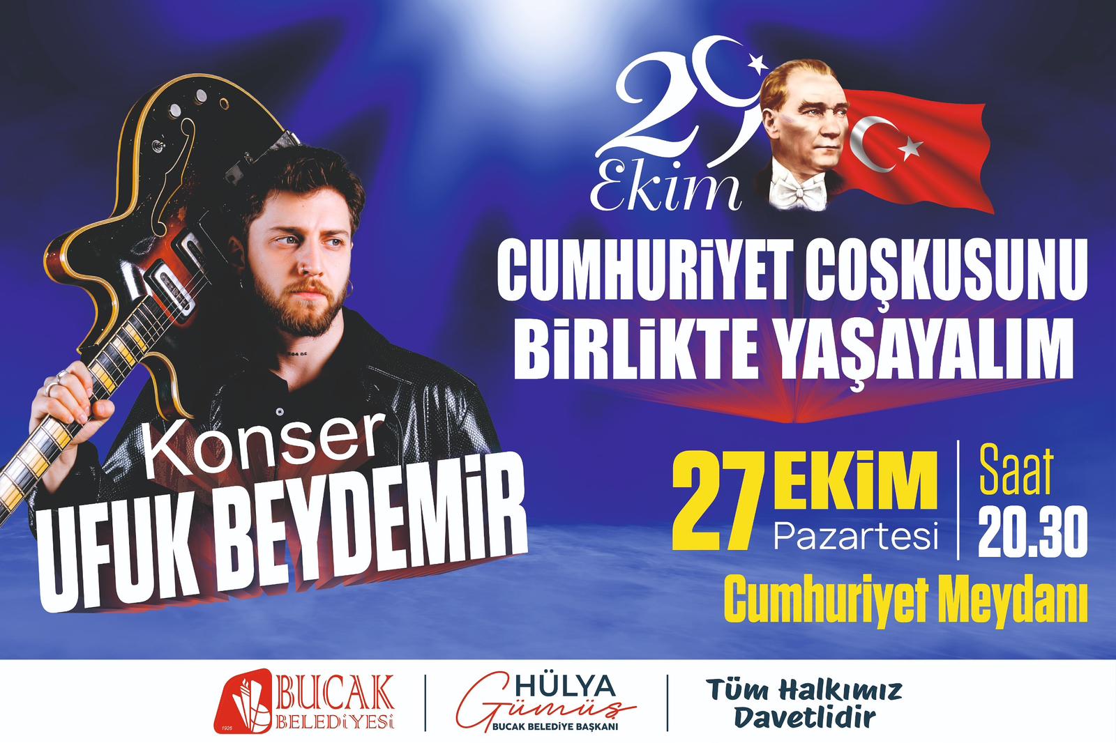 Cumhuriyetimizin 102. yılı, Bucak’ta düzenlenecek etkinliklerle büyük bir coşkuyla kutlanacak. Sevilen sanatçı Ufuk Beydemir, 27 Ekim Pazartesi günü saat 20.30’da Cumhuriyet Meydanı’nda Bucaklılarla buluşacak.