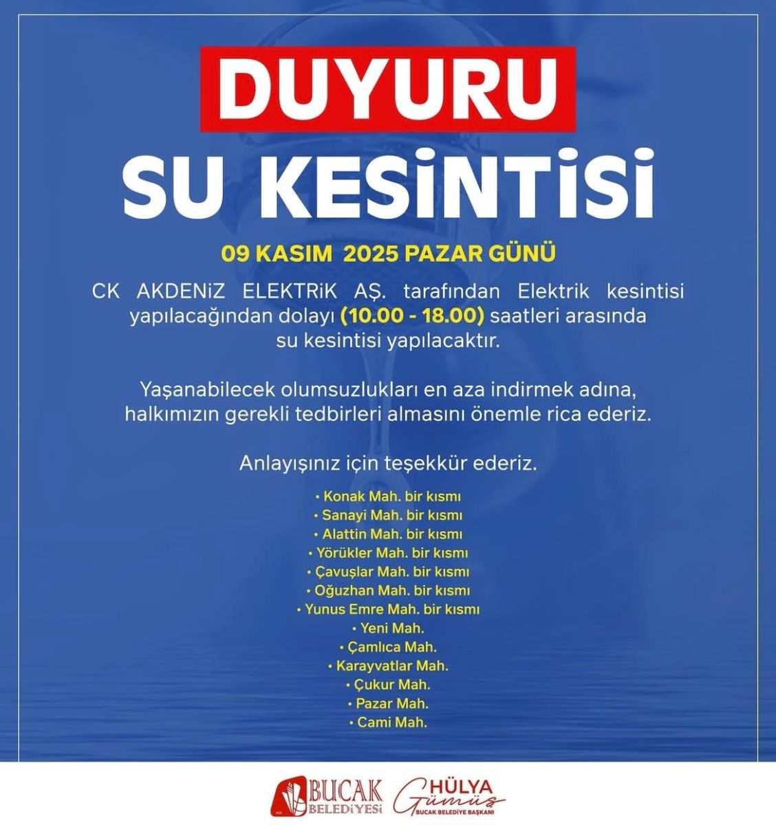 Burdur’un Bucak ilçesinde 9 Kasım 2025 Pazar günü bazı mahallelerde su kesintisi uygulanacak.