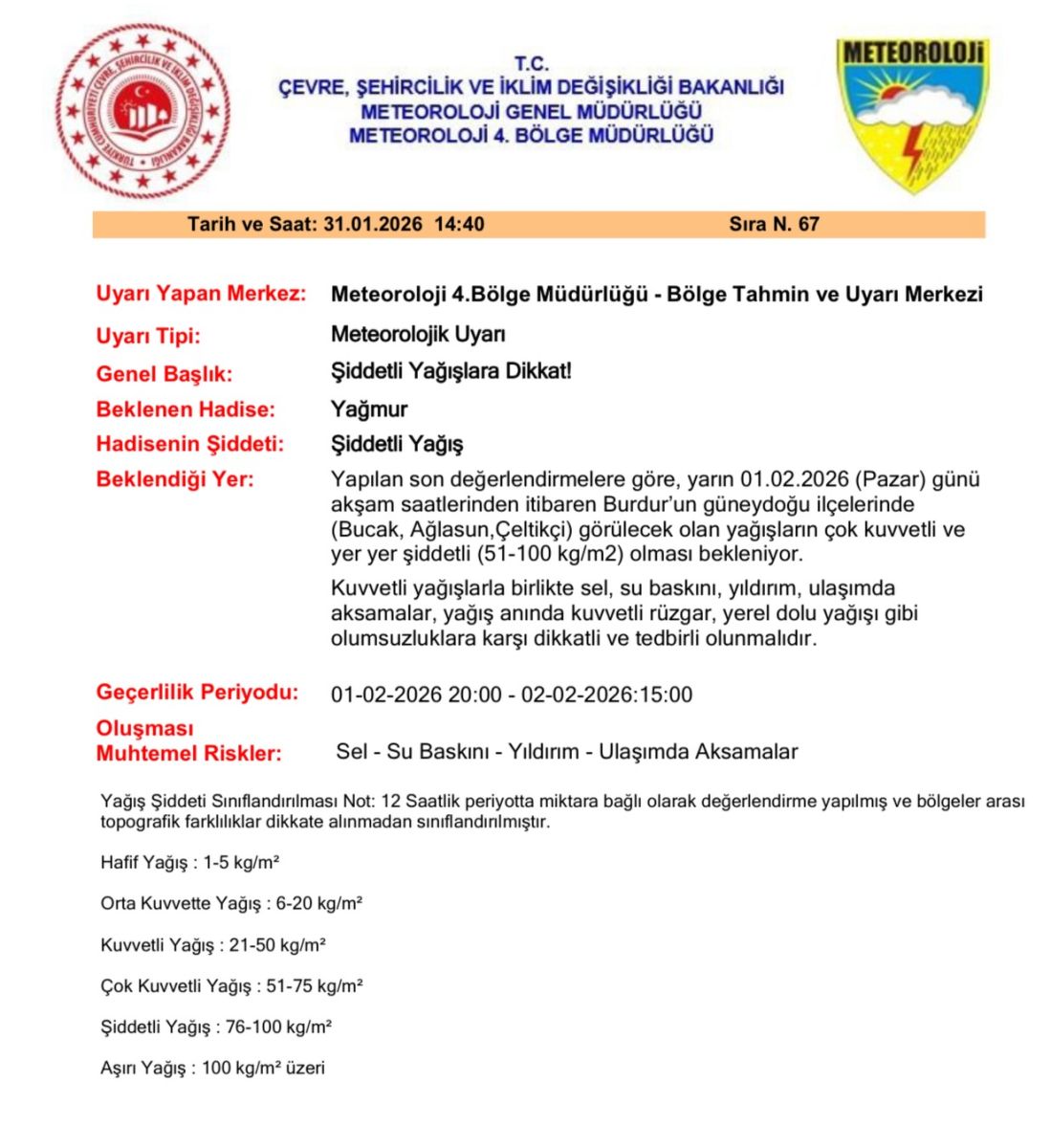 Yapılan açıklamaya göre, 1 Şubat 2026 Pazar günü akşam saatlerinden itibaren Burdur’un Bucak, Ağlasun ve Çeltikçi ilçelerinde çok kuvvetli, yer yer şiddetli yağış bekleniyor. Yağış miktarının metrekareye 51 ila 100 kilogram arasında olacağı tahmin ediliyor.