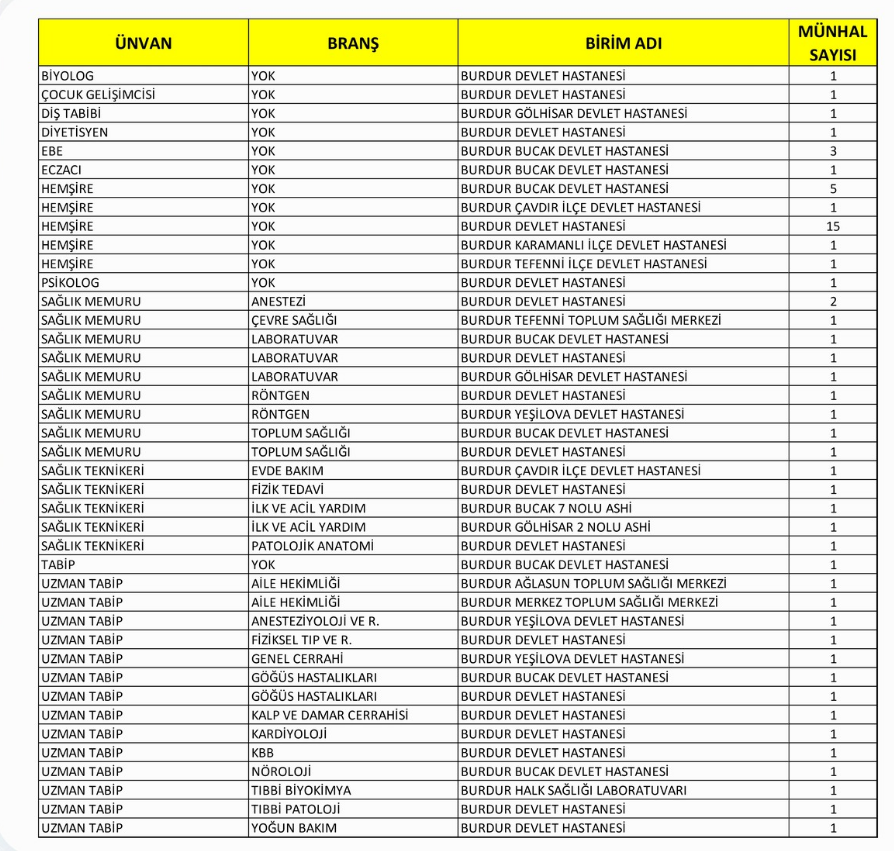 Yayımlanan ilan metnine göre Burdur genelinde toplam 62 kişilik münhal sağlık kadrosu açıldı.