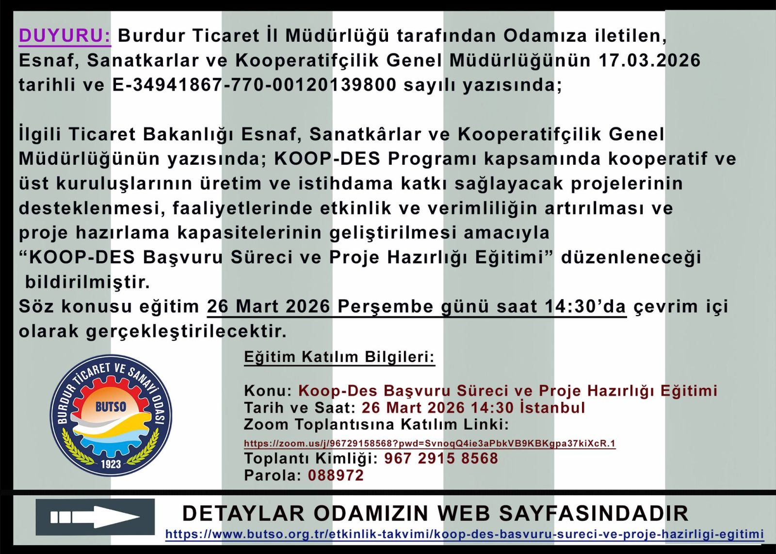 Burdur Ticaret ve Sanayi Odası başkanlığı, Burdur Ticaret İl Müdürlüğü aracılığıyla iletilen bilgiye göre, Ticaret Bakanlığı Esnaf, Sanatkârlar ve Kooperatifçilik Genel Müdürlüğü tarafından “KOOP-DES Başvuru Süreci ve Proje Hazırlığı Eğitimi” gerçekleştirilecek.