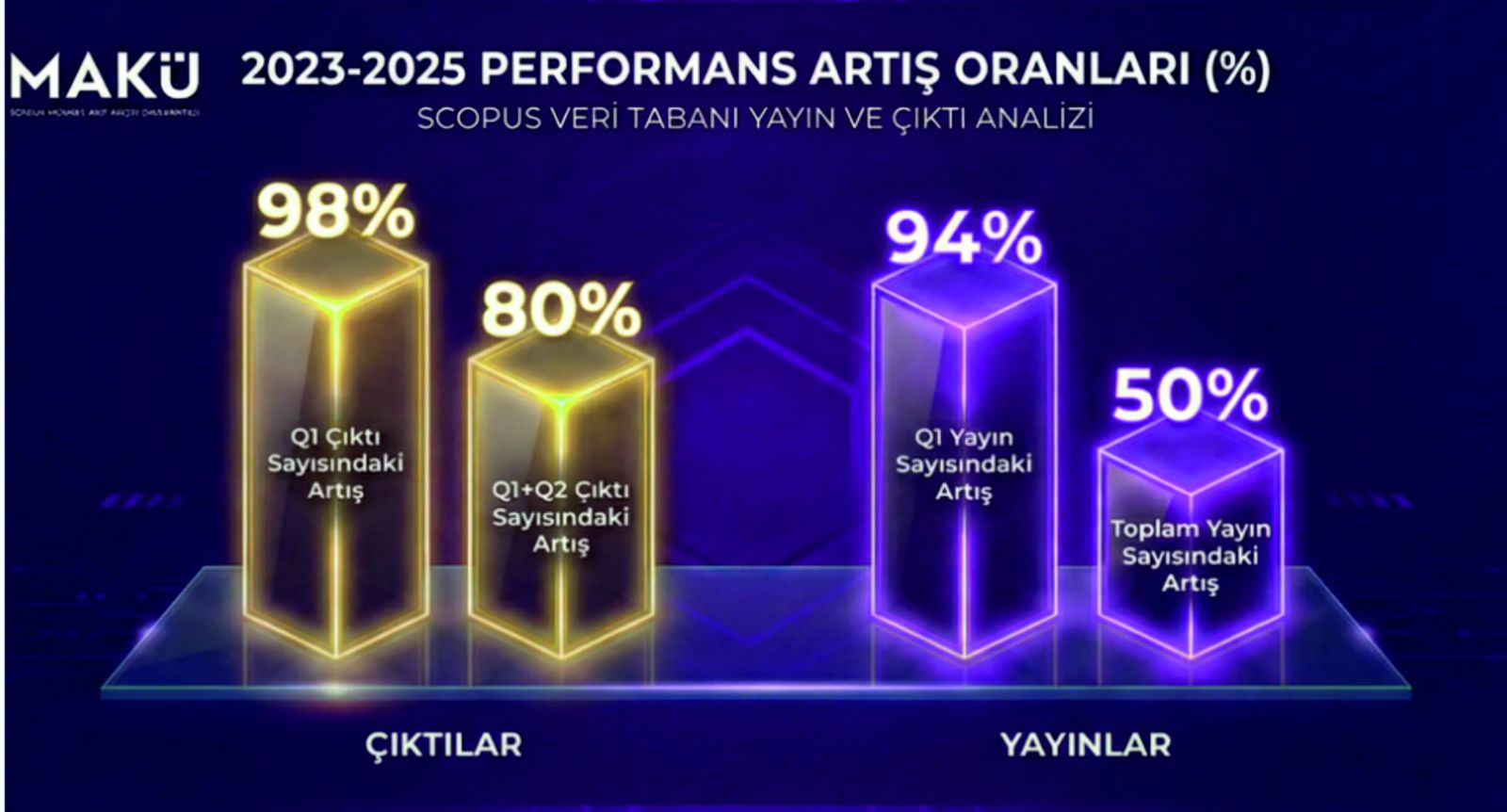 Bilimsel yetkinliğin en önemli göstergelerinden biri kabul edilen Q1 kategorisindeki yayın sayısı, 2023 yılına kıyasla yüzde 98 oranında artış gösterdi. Q1 ve Q2 kategorilerindeki toplam yayın sayısında ise yüzde  80’lik bir büyüme sağlandı. Bu artış, MAKÜ’nün yalnızca yayın sayısını değil, nitelikli yayın havuzunu da kararlılıkla genişlettiğini ortaya koyuyor.