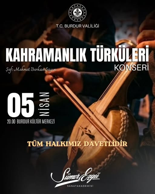 Burdur Valiliği tarafından düzenlenen "Kahramanlık Türküleri Konseri", sanatseverlerle buluşuyor. Şef Mehmet Berkan Sayın yönetiminde gerçekleştirilecek olan etkinlikte, Türk müziğinin kahramanlık temalı eserleri icra edilecek.