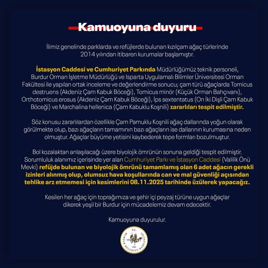 Burdur Belediyesi, şehir genelinde parklarda ve refüjlerde yer alan kızılçam ağaçlarında yaşanan kurumalarla ilgili önemli bir açıklama yaptı. Belediye, konuyla ilgili duyuruyu resmi sosyal medya hesabı üzerinden kamuoyuyla paylaştı.