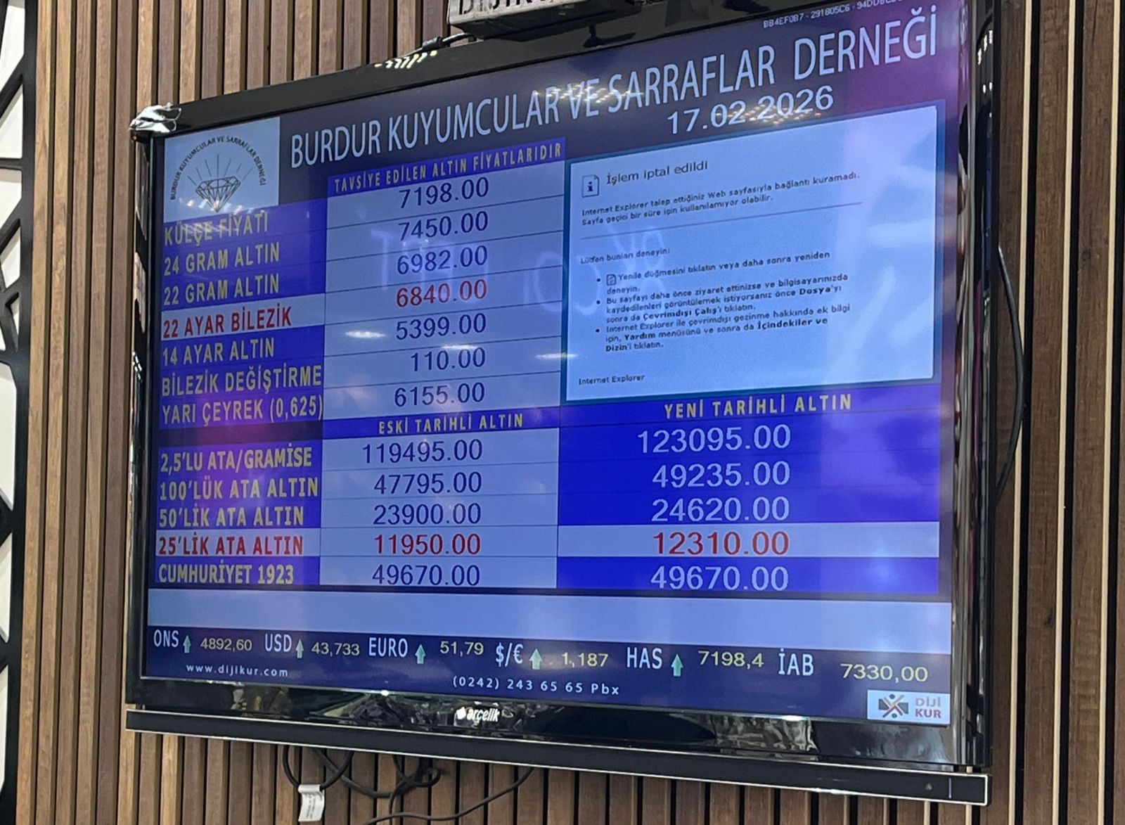 Burdur Kuyumcular ve Sarraflar Derneği tarafından 17 Şubat 2026 Salı günü saat 09.00 itibarıyla güncel altın fiyatları şu şekilde: