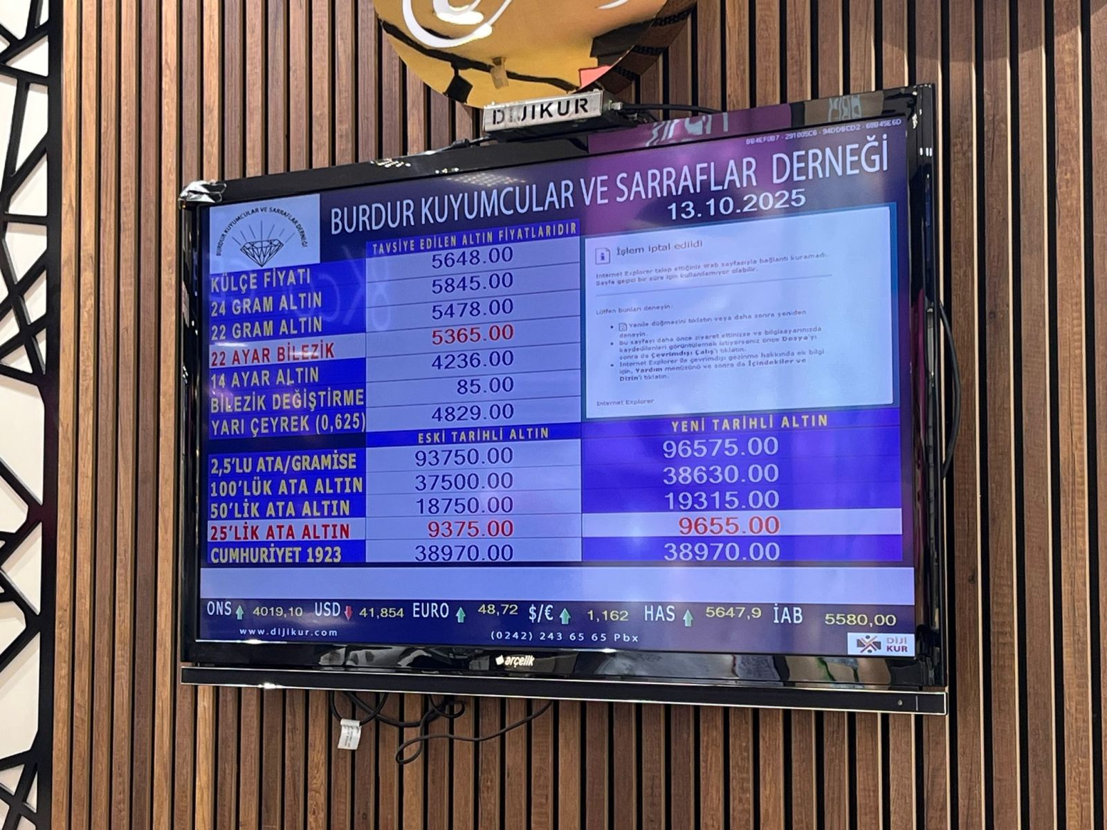 Burdur Kuyumcular ve Sarraflar Derneği tarafından 13 Ekim 2025 Pazartesi günü saat 09.00 itibarıyla açıklanan güncel altın fiyatları belli oldu. Dernek tarafından yayımlanan listeye göre, altın fiyatlarında 11 Ekim 2025 Cumartesi gününe kıyasla gözle görülür bir artış yaşanmadı