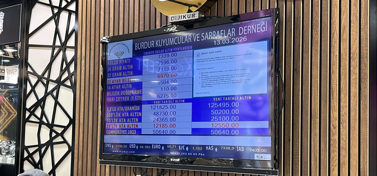 Burdur Kuyumcular ve Sarraflar Derneği tarafından 13 Mart 2026 Cuma günü saat 09.00 itibarıyla güncel altın fiyatları şu şekilde: