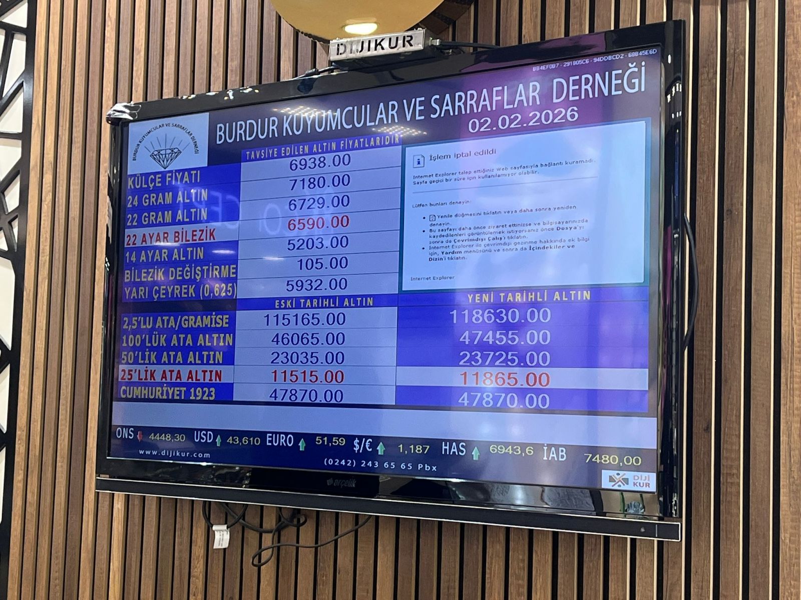 Burdur Kuyumcular ve Sarraflar Derneği tarafından 2 Şubat 2026 Pazartesi günü saat 09.00 itibarıyla güncel altın fiyatları şu şekilde: