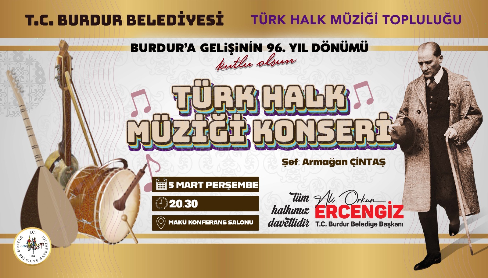 Burdur Belediyesi Türk Halk Müziği Topluluğu tarafından düzenlenecek olan konser, Şef Armağan Çintaş yönetiminde gerçekleştirilecek. Şehrin kültürel mirasını ve Atatürk sevgisini bir araya getiren bu özel gecede, Anadolu’nun ruhunu yansıtan türküler seslendirilecek.