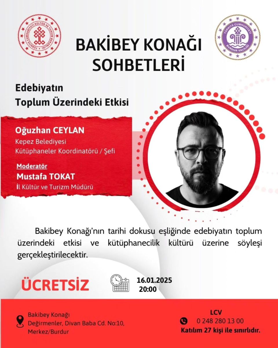 Burdur Valiliği öncülüğünde düzenlenen Bakibey Konağı Sohbetleri, 16 Ocak 2026 Cuma günü başlıyor. Katılımın sınırlı olacağı etkinlikler için rezervasyon yaptırmak isteyen vatandaşlar, 0 (248) 280 13 00 numaralı telefondan bilgi alabilecek.