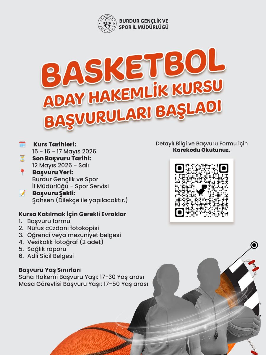 Basketbol hakemliği kariyerine adım atmak isteyen adaylar için açılan kursa başvurular, 12 Mayıs 2026 Salı gününe kadar devam edecek. Adayların başvurularını, İl Müdürlüğü Spor Servisine şahsen ve dilekçe ile yapmaları gerekiyor.